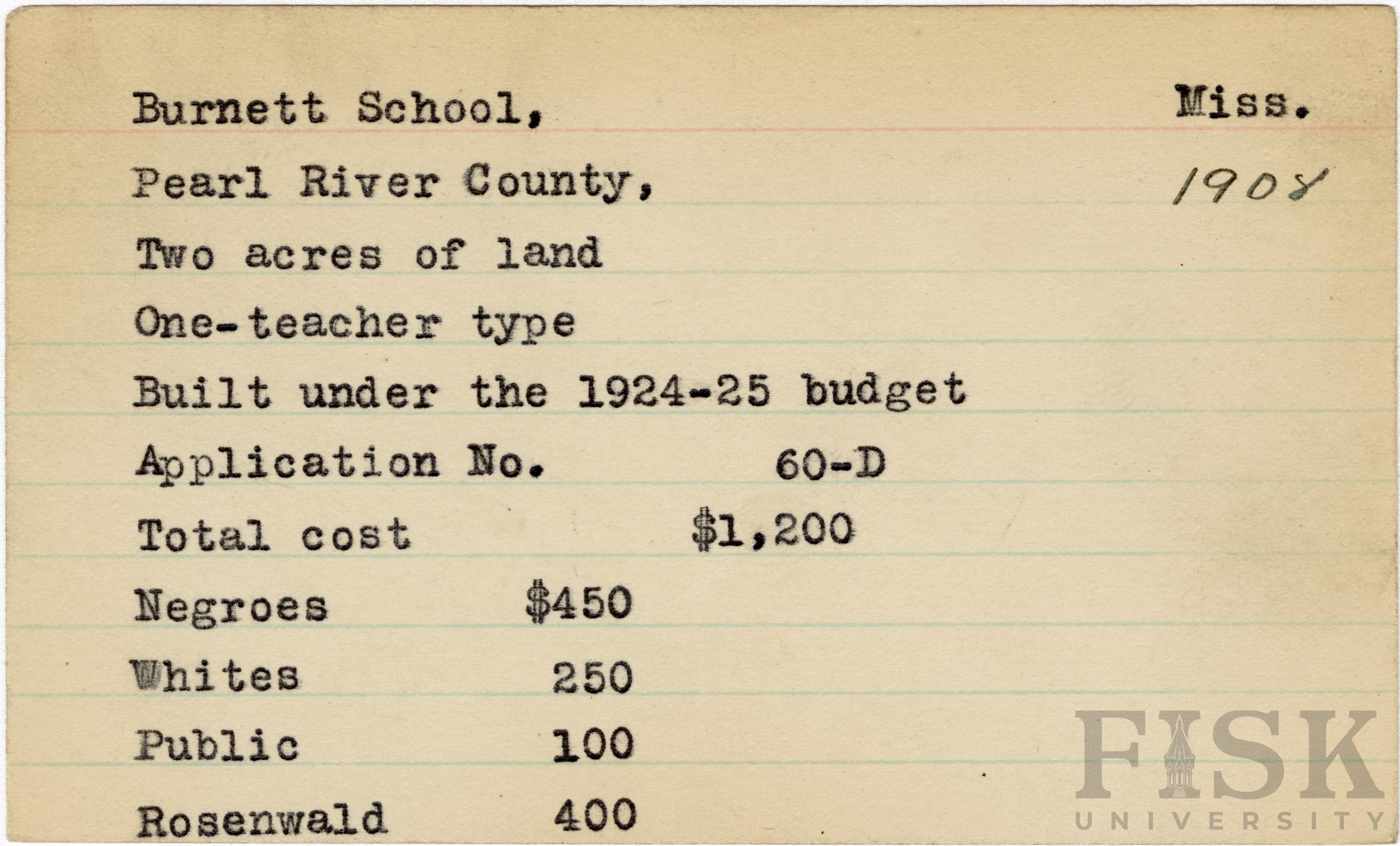 - School card from Rosenwald Fund for Burnett School in Pearl River County, Mississippi