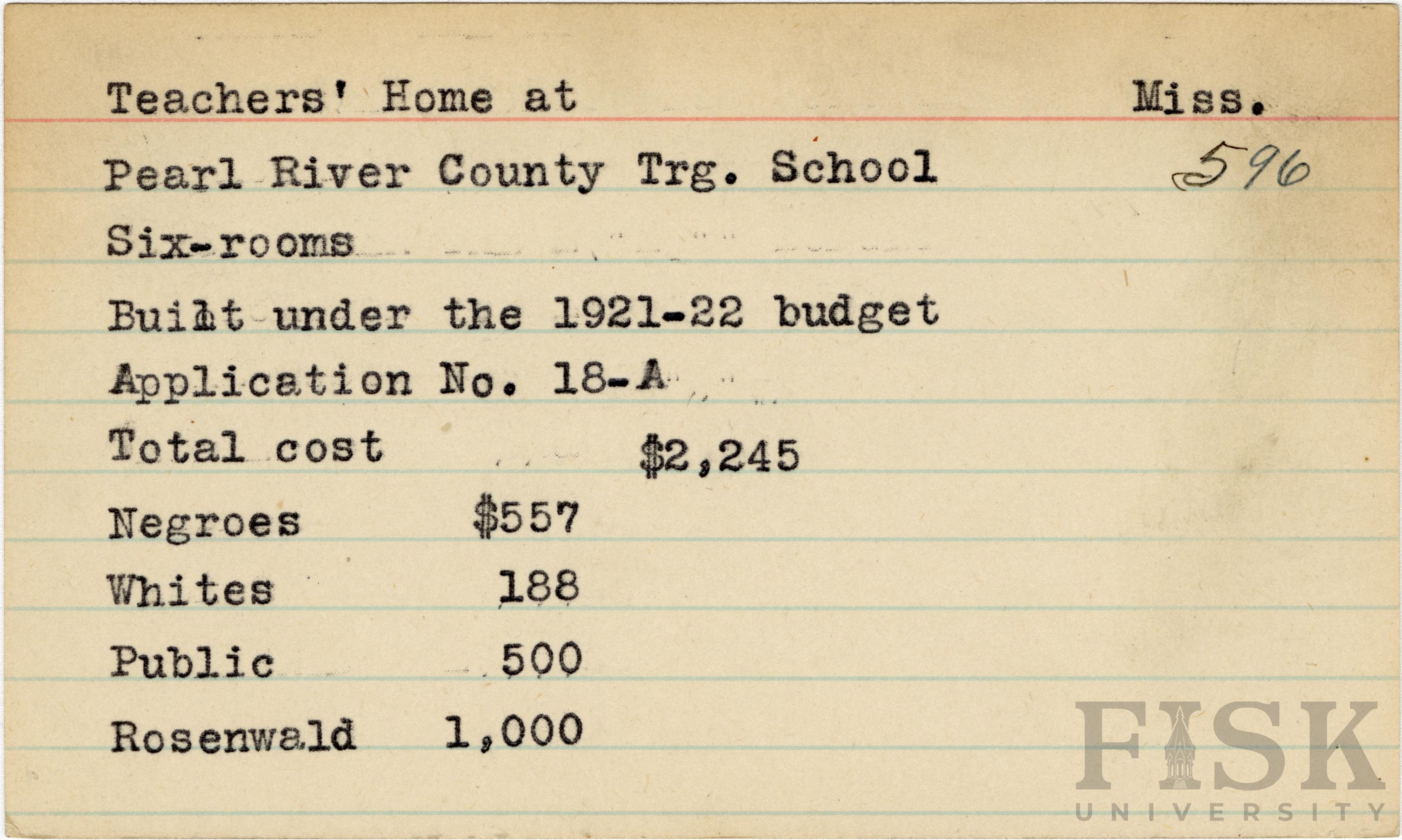 - School card from Rosenwald Fund for the six room teacher's home at County Training School in Pearl River County, Mississippi