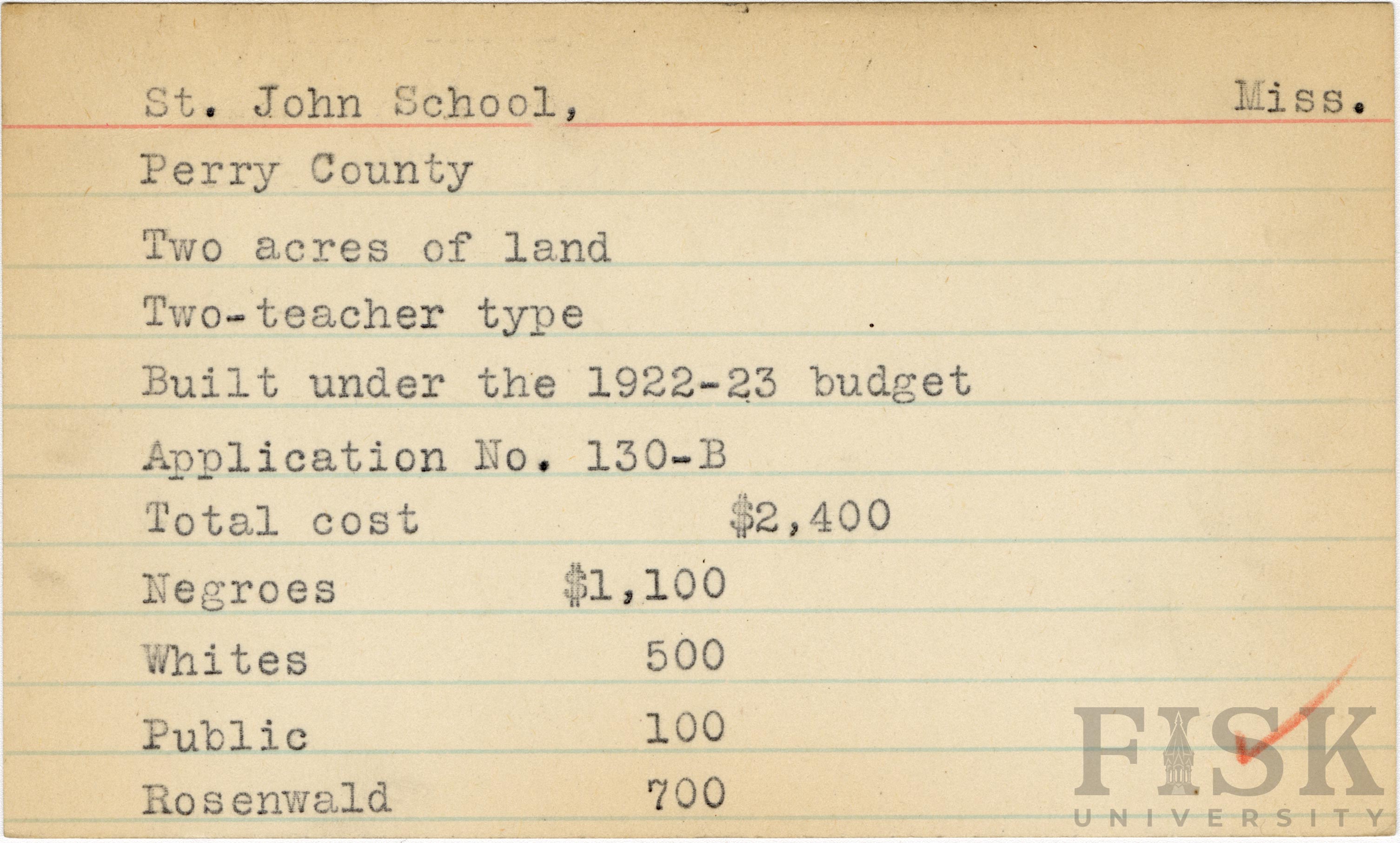 - School card from Rosenwald Fund for St. John School in Perry County, Mississippi