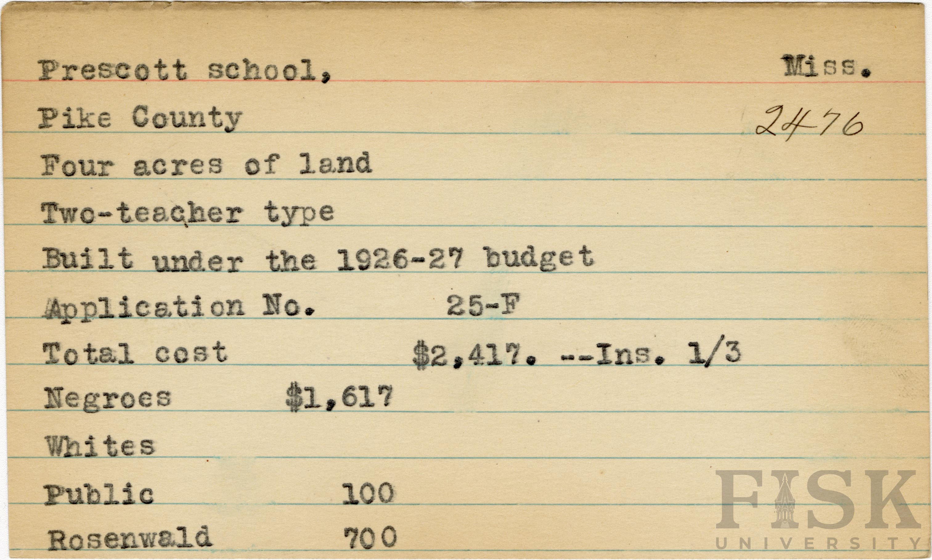 - Julius Rosenwald Fund, Julius Rosenwald Fund--Buildings, African American schools--History--20th century, African American schools -- Prescott School