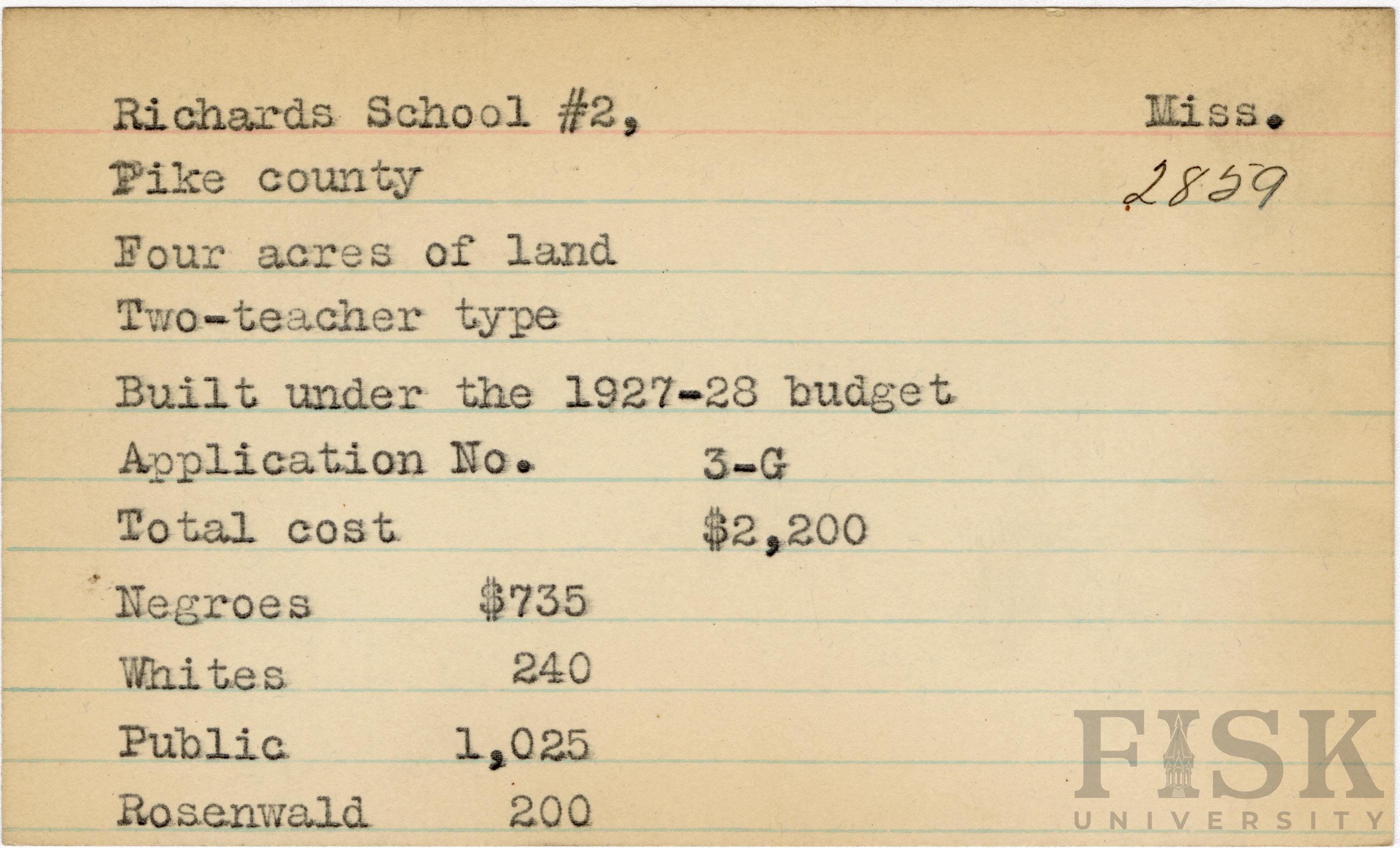 - School card from Rosenwald Fund for Richards School No. 2 in Pike County, Mississippi