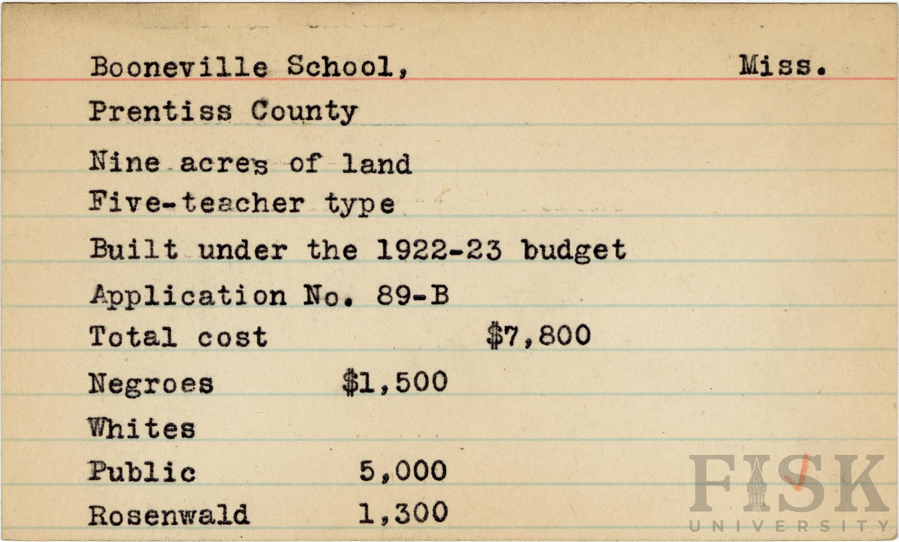 - School card from Rosenwald Fund for Booneville School in Prentiss County, Mississippi