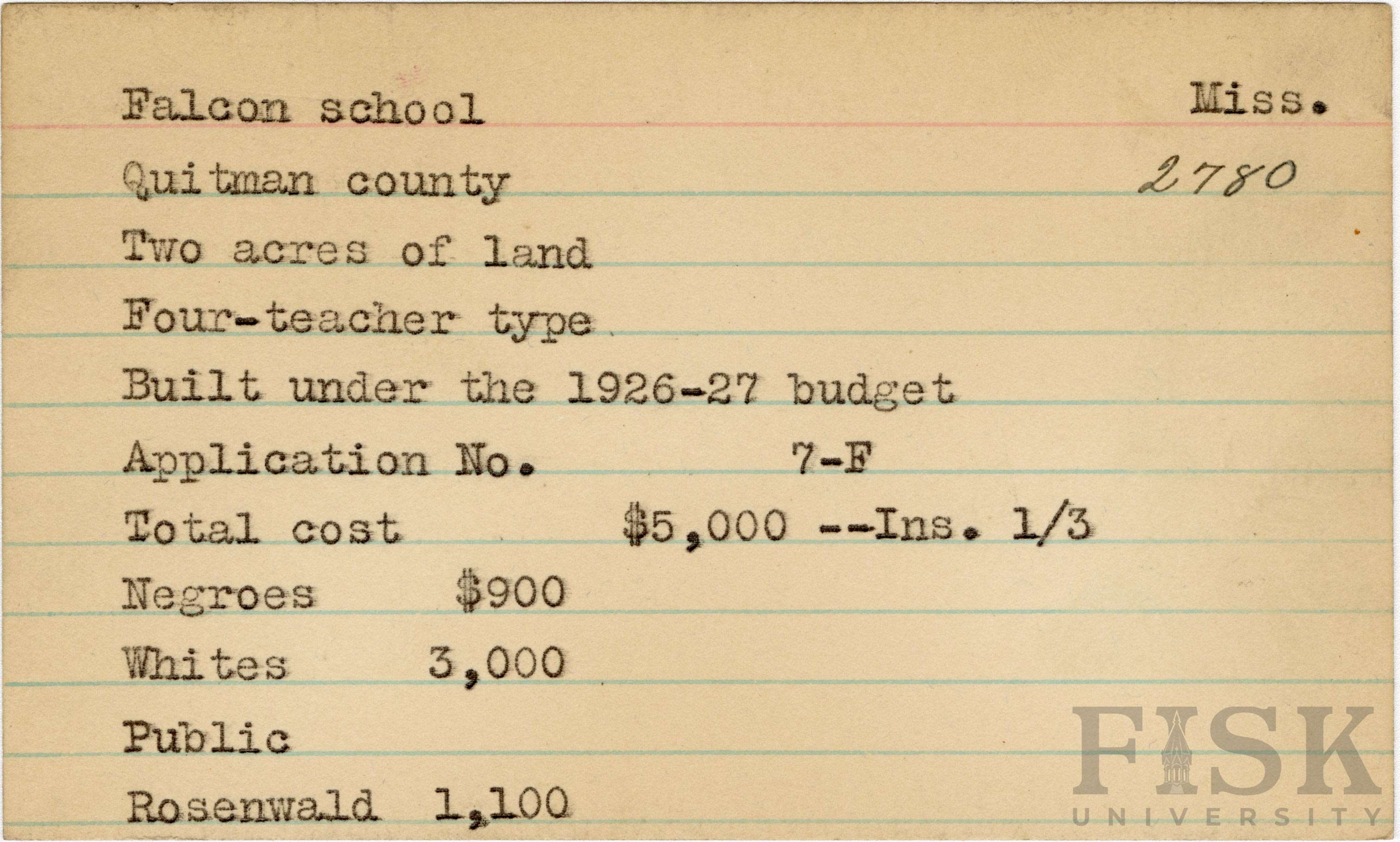 - School card from Rosenwald Fund for Falcon School in Quitman County, Mississippi with a section added to the budget contributions that says, "Ins. 1/3"