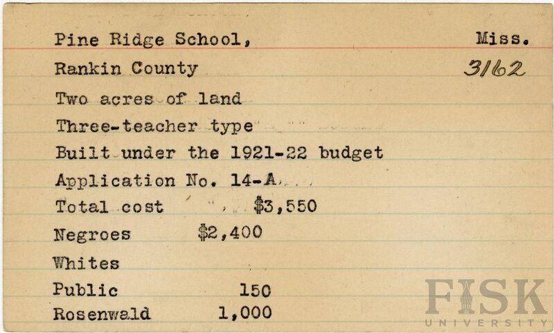 - School card from Rosenwald Fund for Pine Ridge School in Rankin County, Mississippi