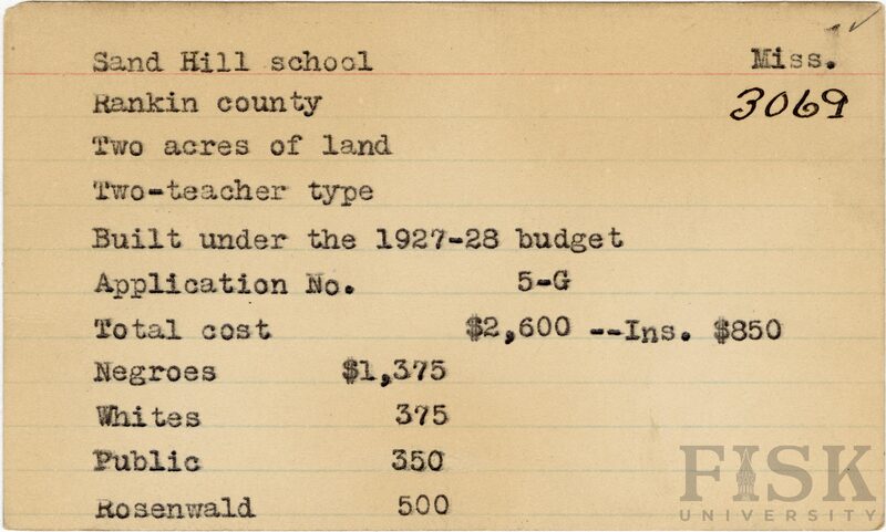 - School card from Rosenwald Fund for Sand Hill School in Rankin County, Mississippi with a section added to the budget contributions that says, "Ins. $850"
