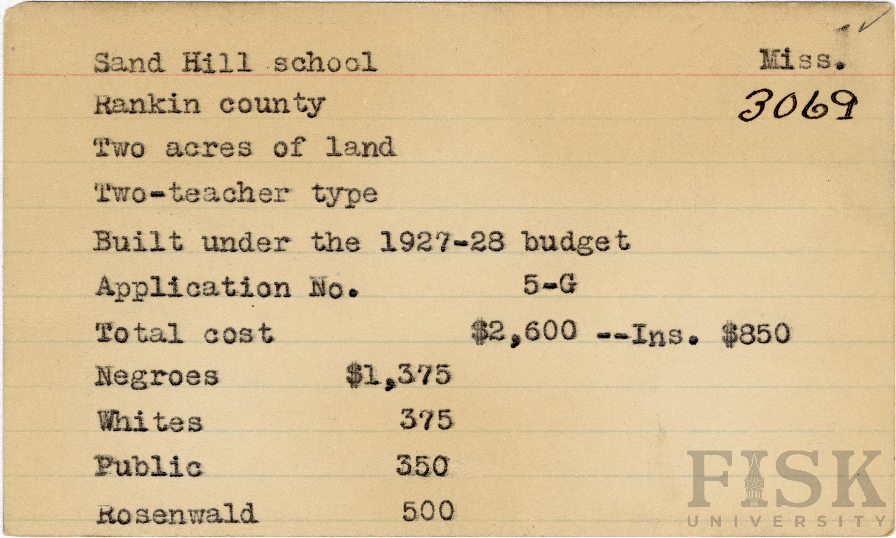 School card from Rosenwald Fund for Sand Hill School in Rankin County, Mississippi with a section added to the budget contributions that says, "Ins. $850"