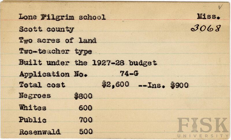 - School card from Rosenwald Fund for Lone Pilgrim School in Scott County, Mississippi with a section added to the budget contributions that says, "Ins. $900"