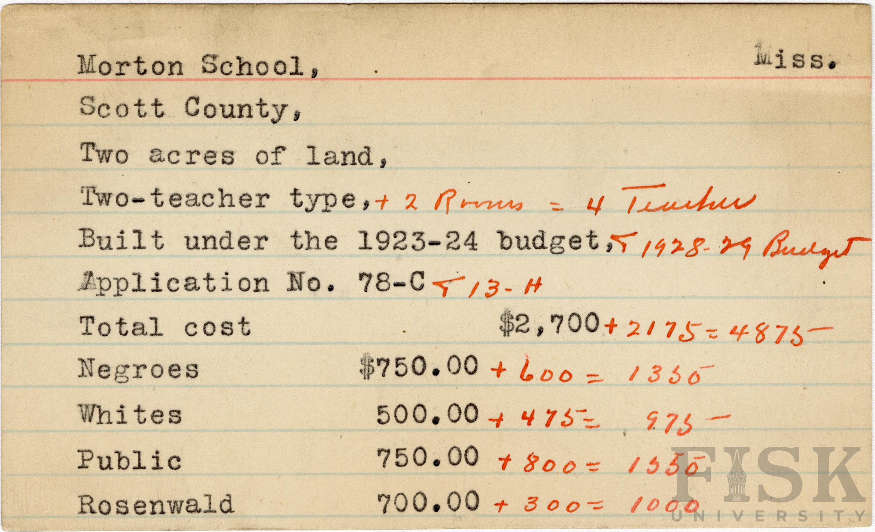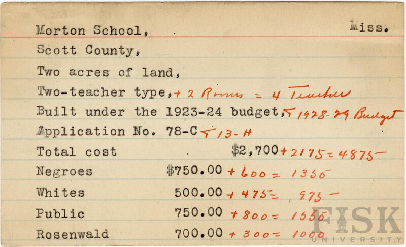 - School card from Rosenwald Fund for Morton School in Scott County, Mississippi with handwritten additions to the teacher type, budget year, application number, and budget contribution sections