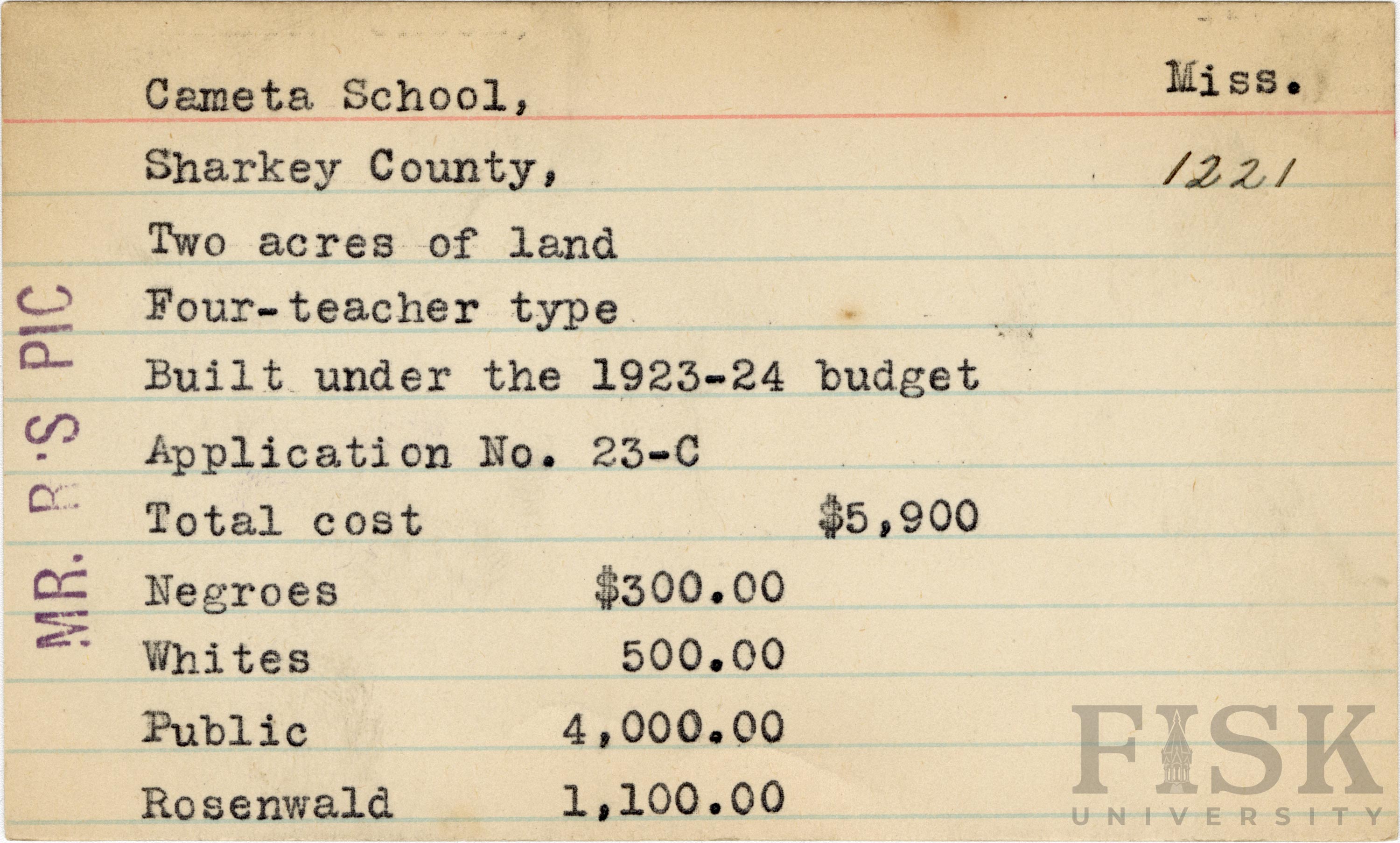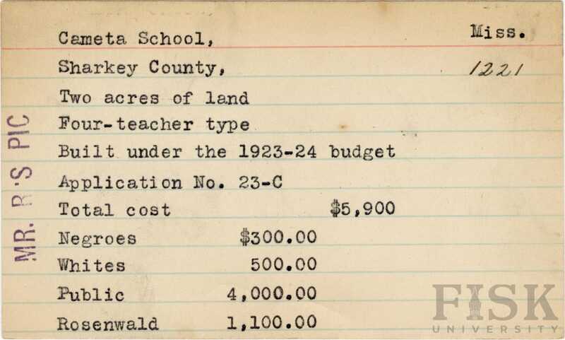 - School card from Rosenwald Fund for Cameta School in Sharkey County, Mississippi with a note on the far left of the card that says, "Mr. R's Pic"