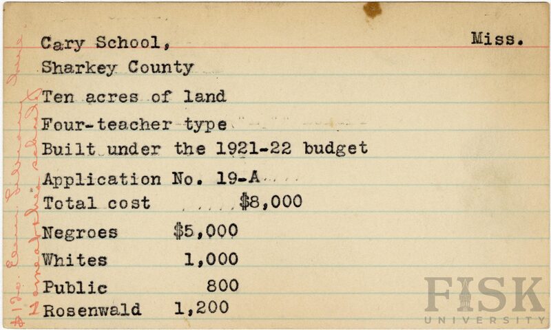 - School card from Rosenwald Fund for Cary School in Sharkey County, Mississippi with handwritten notes on the far left of the card that say, "$120 elem library here" and "home at this school"