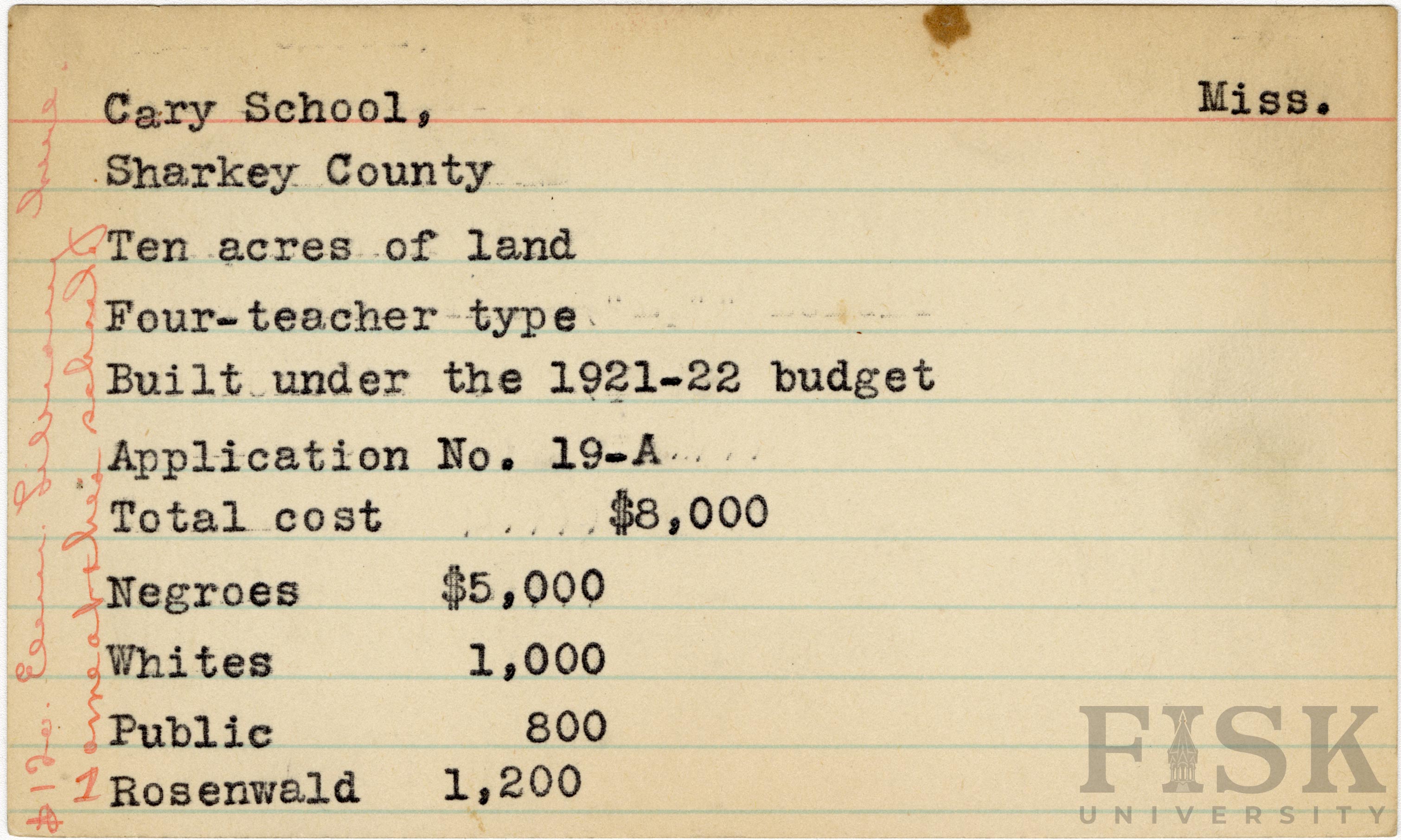 School card from Rosenwald Fund for Cary School in Sharkey County, Mississippi with handwritten notes on the far left of the card that say, "$120 elem library here" and "home at this school"