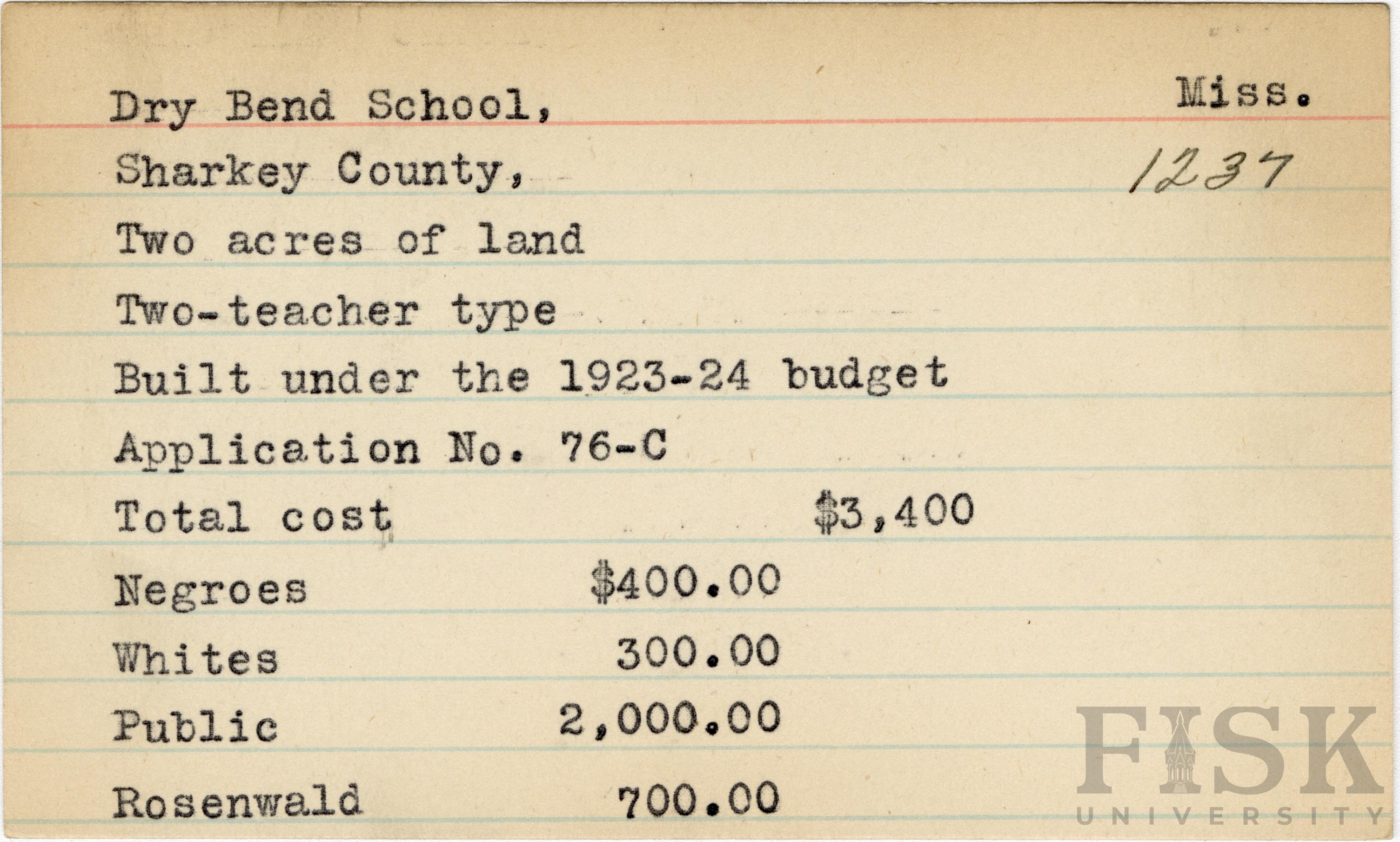 - School card from Rosenwald Fund for Dry Bend School in Sharkey County, Mississippi