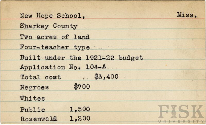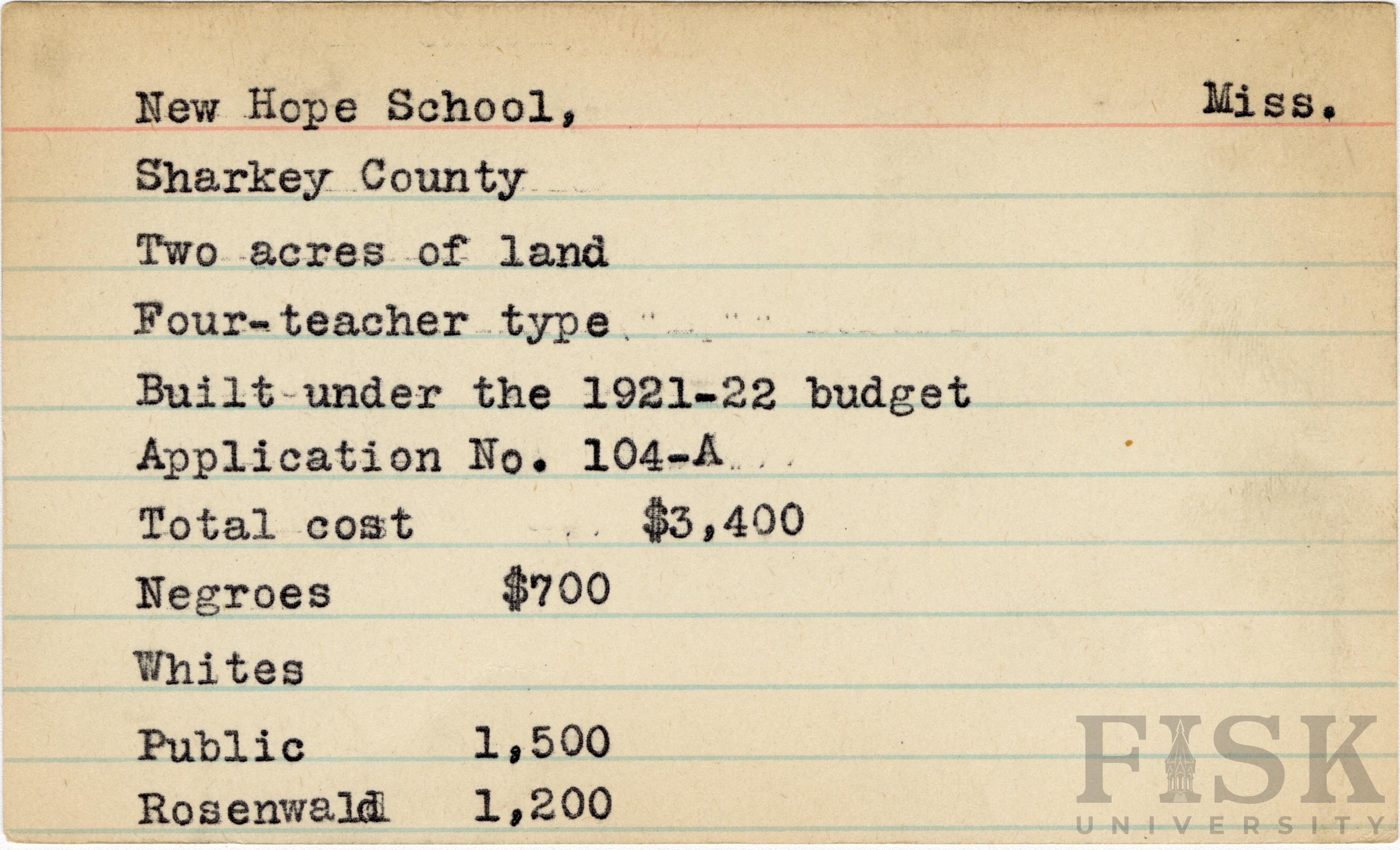 - School card from Rosenwald Fund for New Hope School in Sharkey County, Mississippi