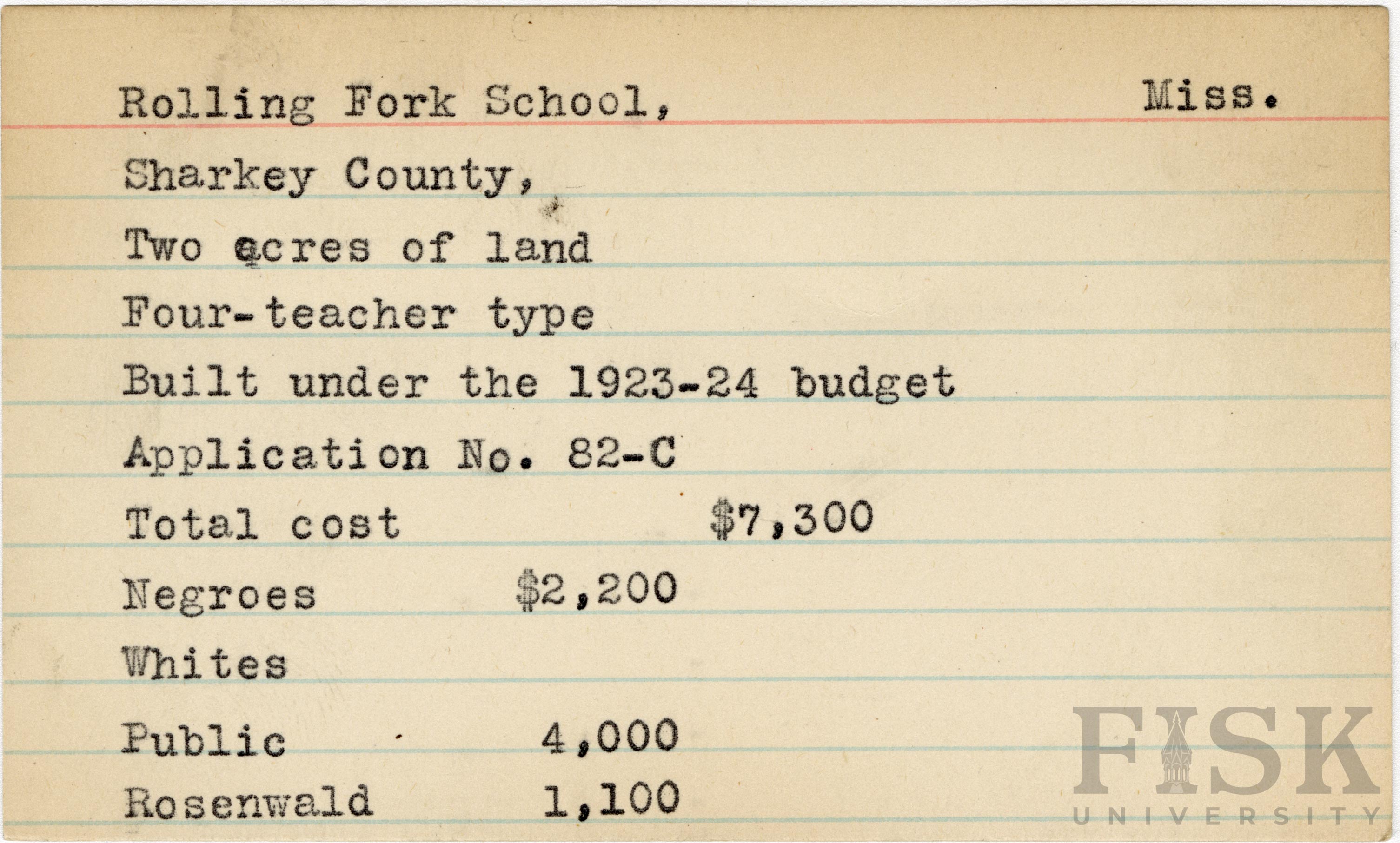 - School card from Rosenwald Fund for Rolling Fork School in Sharkey County, Mississippi