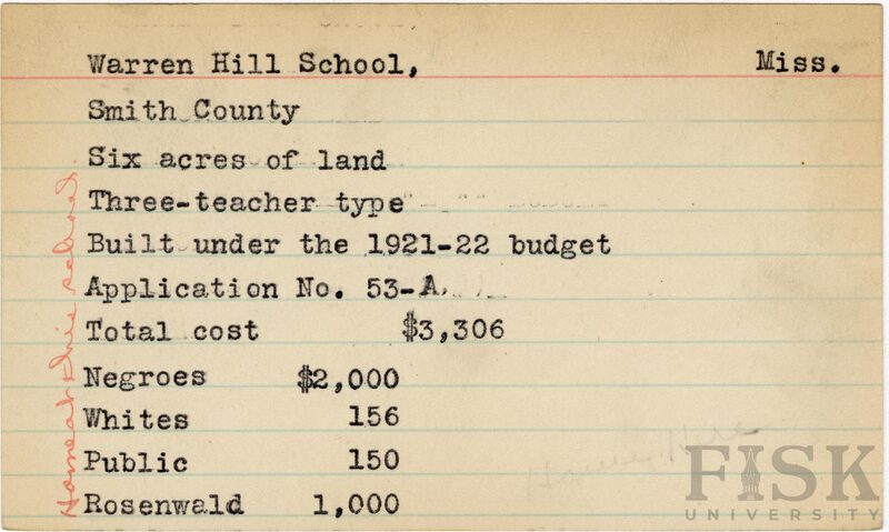 - School card from Rosenwald Fund for Warren Hill School in Smith County, Mississippi with a handwritten note on the far left of the card that says, "home at this school"