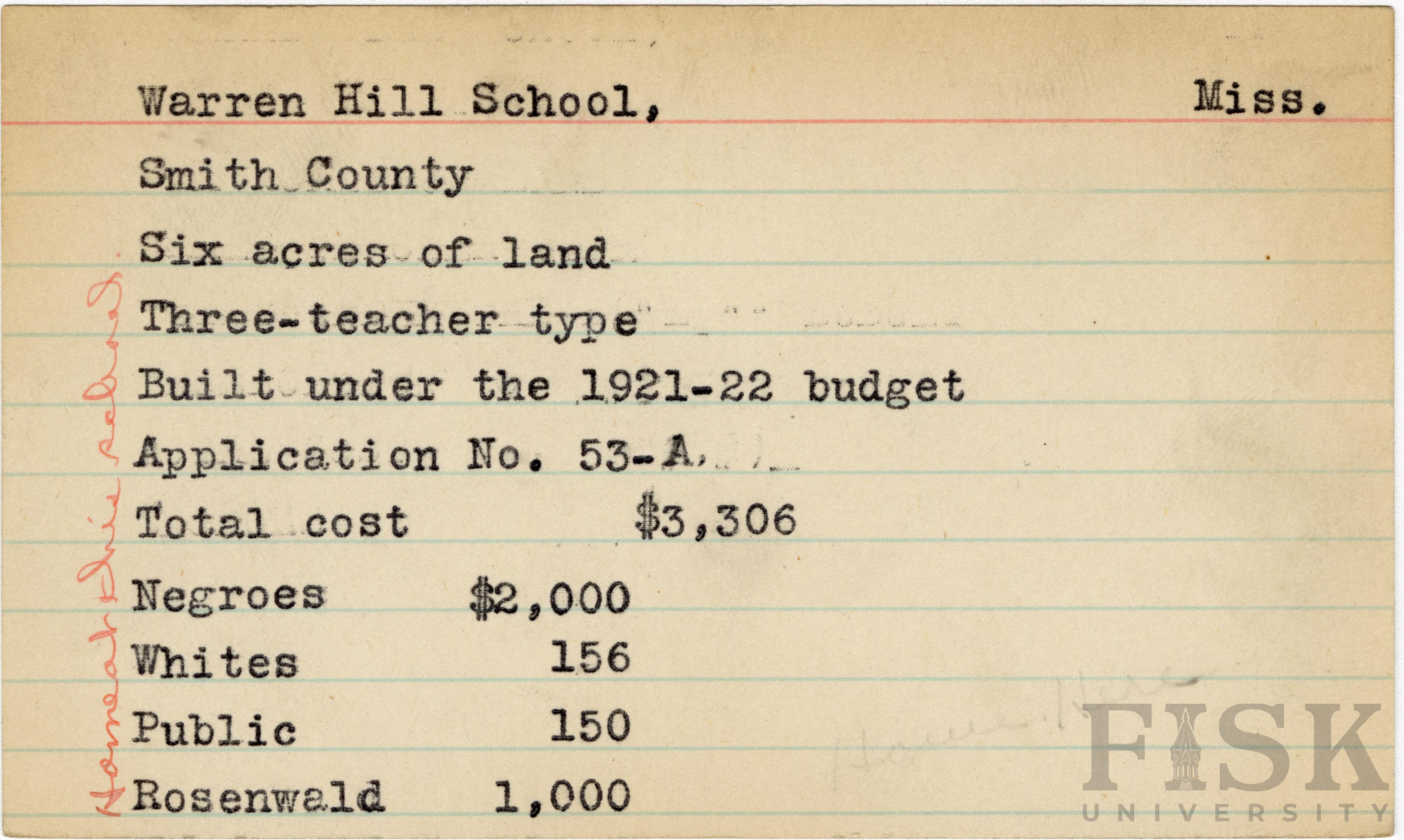 School card from Rosenwald Fund for Warren Hill School in Smith County, Mississippi with a handwritten note on the far left of the card that says, "home at this school"