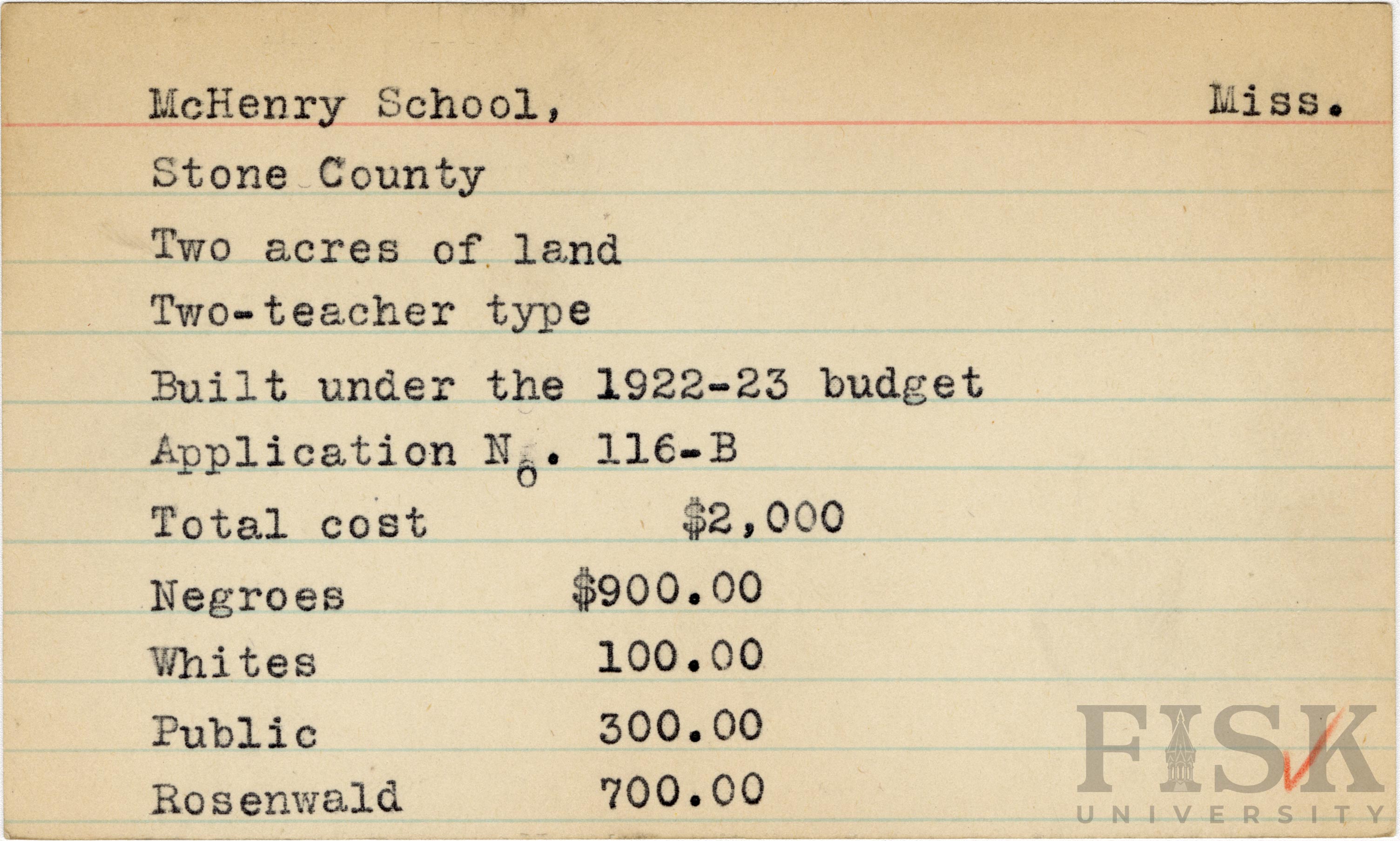 - School card from Rosenwald Fund for McHenry School in Stone County, Mississippi