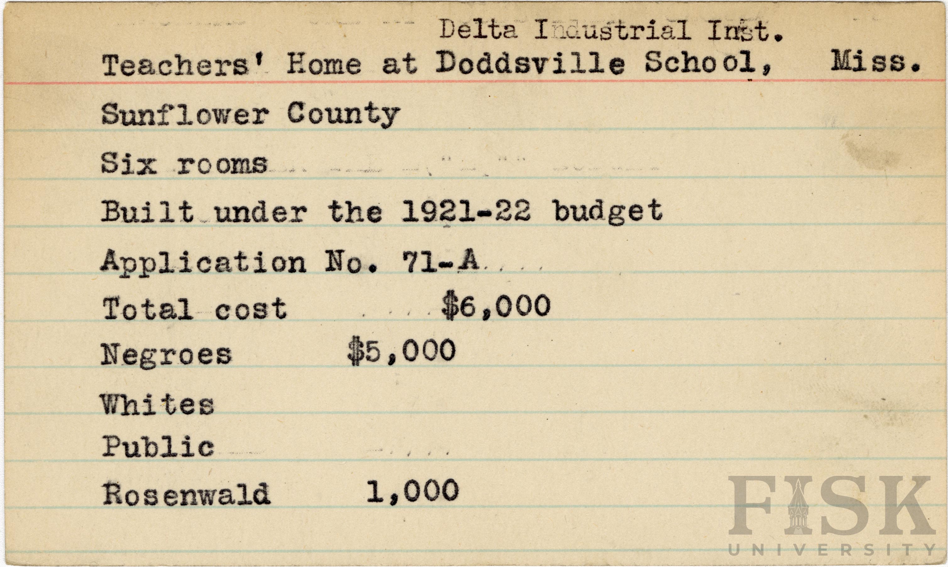 - School card from Rosenwald Fund for the six room teacher's home at Delta Industrial Institute in Sunflower County, Mississippi