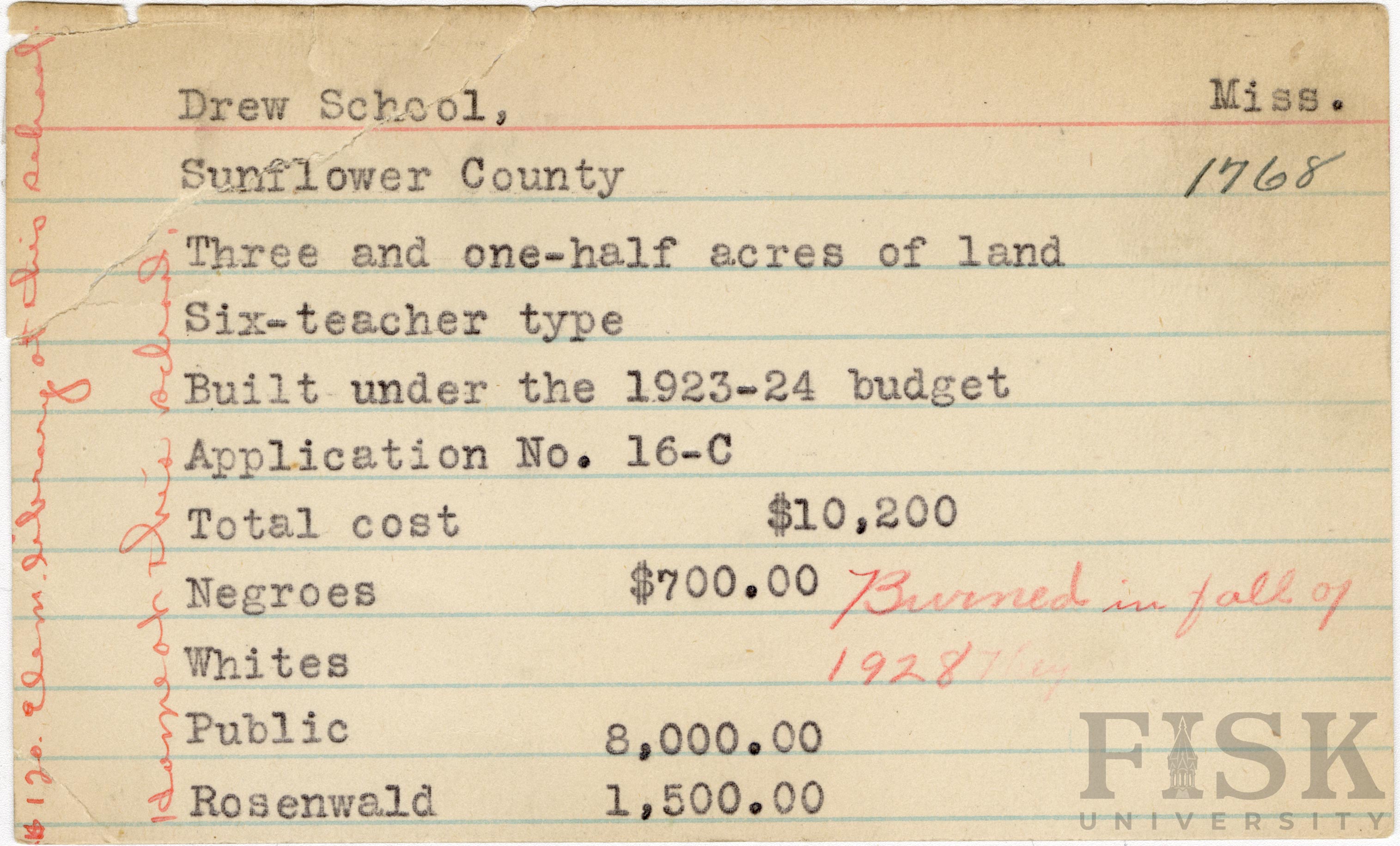 School card from Rosenwald Fund for Drew School in Sunflower County, Mississippi with handwritten notes that say, "Burned in fall of 1928," "$120 elem library at this school," and "home at this school"