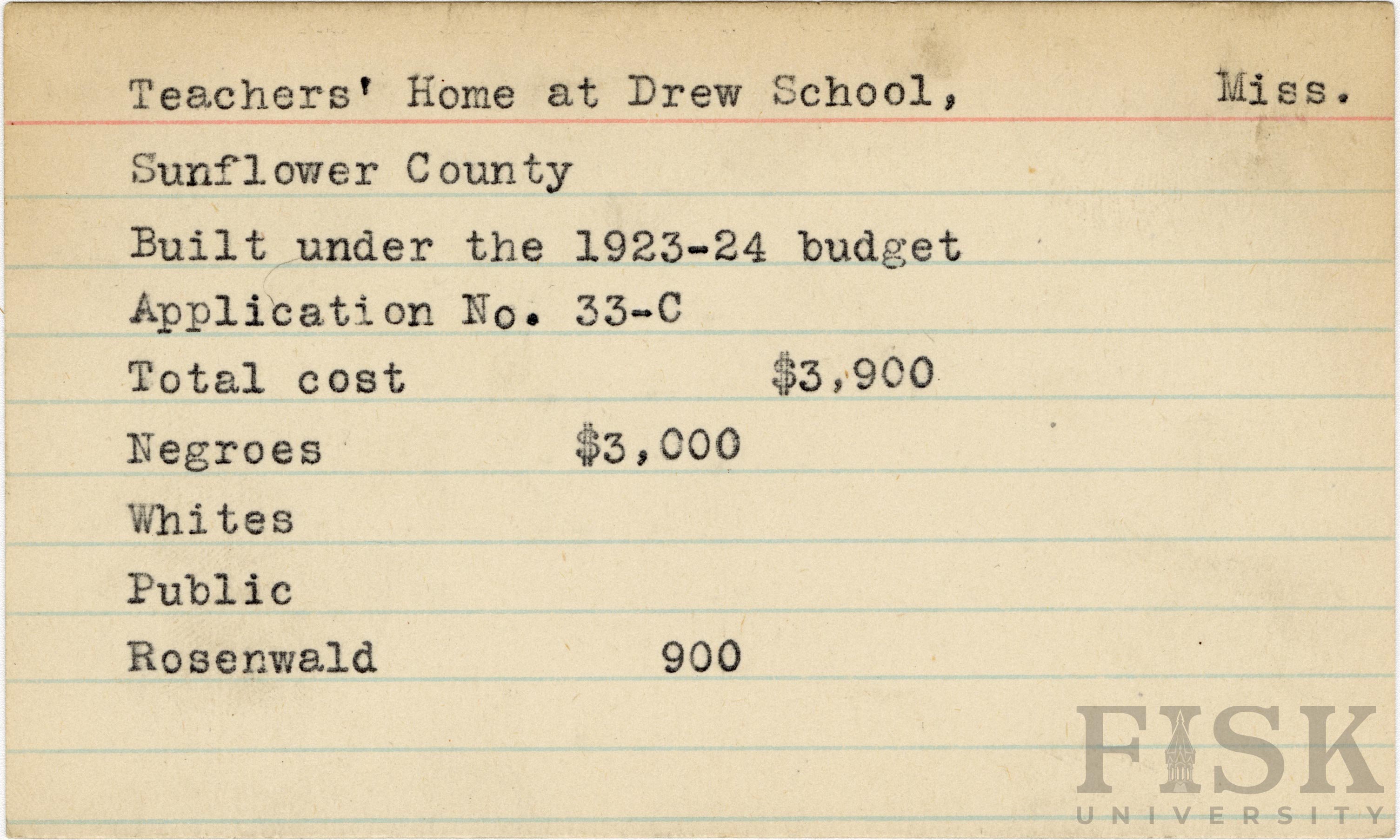 School card from Rosenwald Fund for the teacher's home at Drew School in Sunflower County, Mississippi