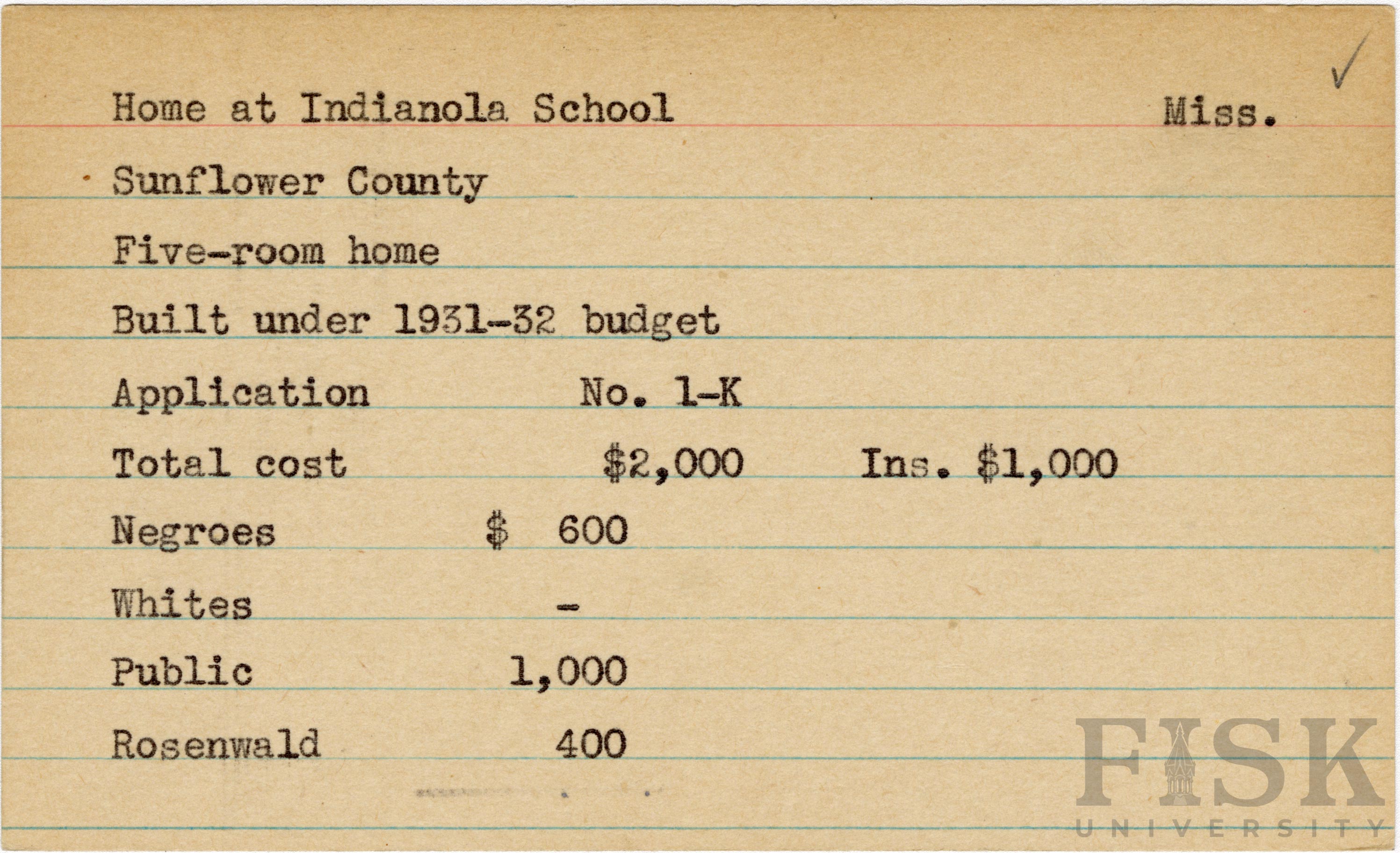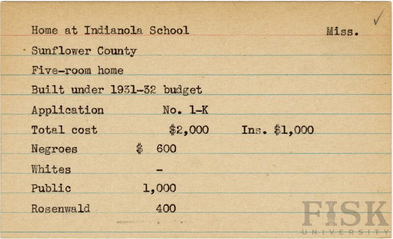 - School card from Rosenwald Fund for the five room teacher's home at Indianola School in Sunflower County, Mississippi with a section added to the budget contributions that says, "Ins. $1,000"