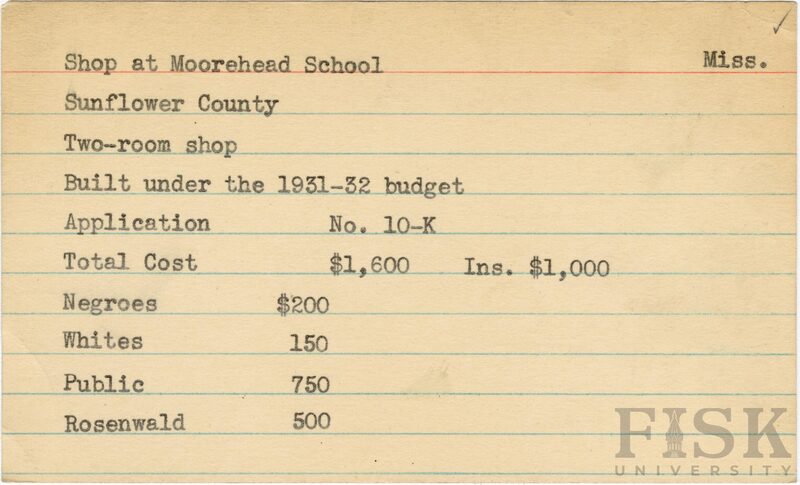 - School card from Rosenwald Fund for the two room shop at Moorhead School in Sunflower County, Mississippi with a section added to the budget contributions that says, "Ins. $1,000"