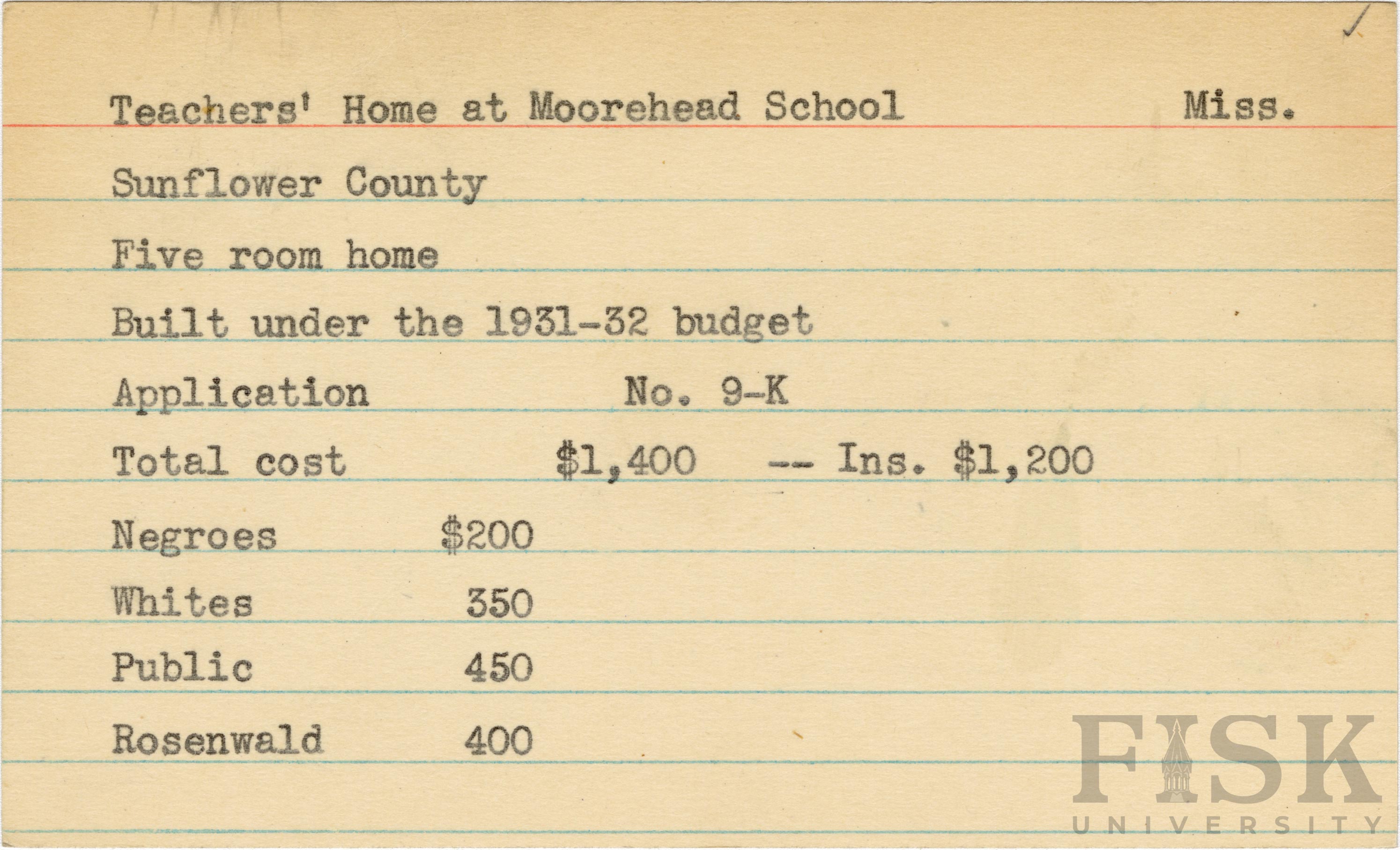 - School card from Rosenwald Fund for the five room teacher's home at Moorhead School in Sunflower County, Mississippi with a section added to the budget contributions that says, "Ins. $1,200"