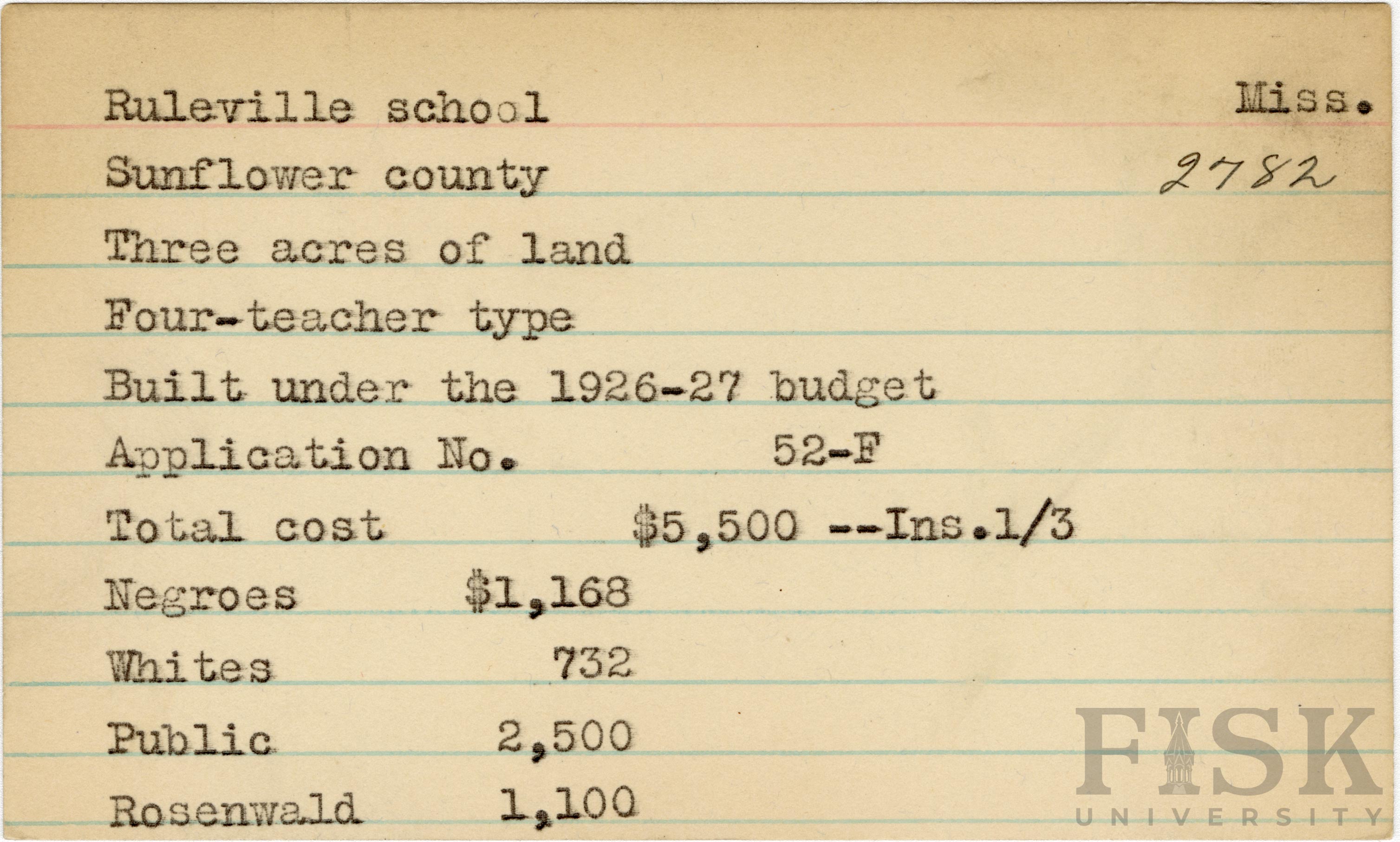 School card from Rosenwald Fund for Ruleville School in Sunflower County, Mississippi with a section added to the budget contributions that says, "Ins. 1/3"