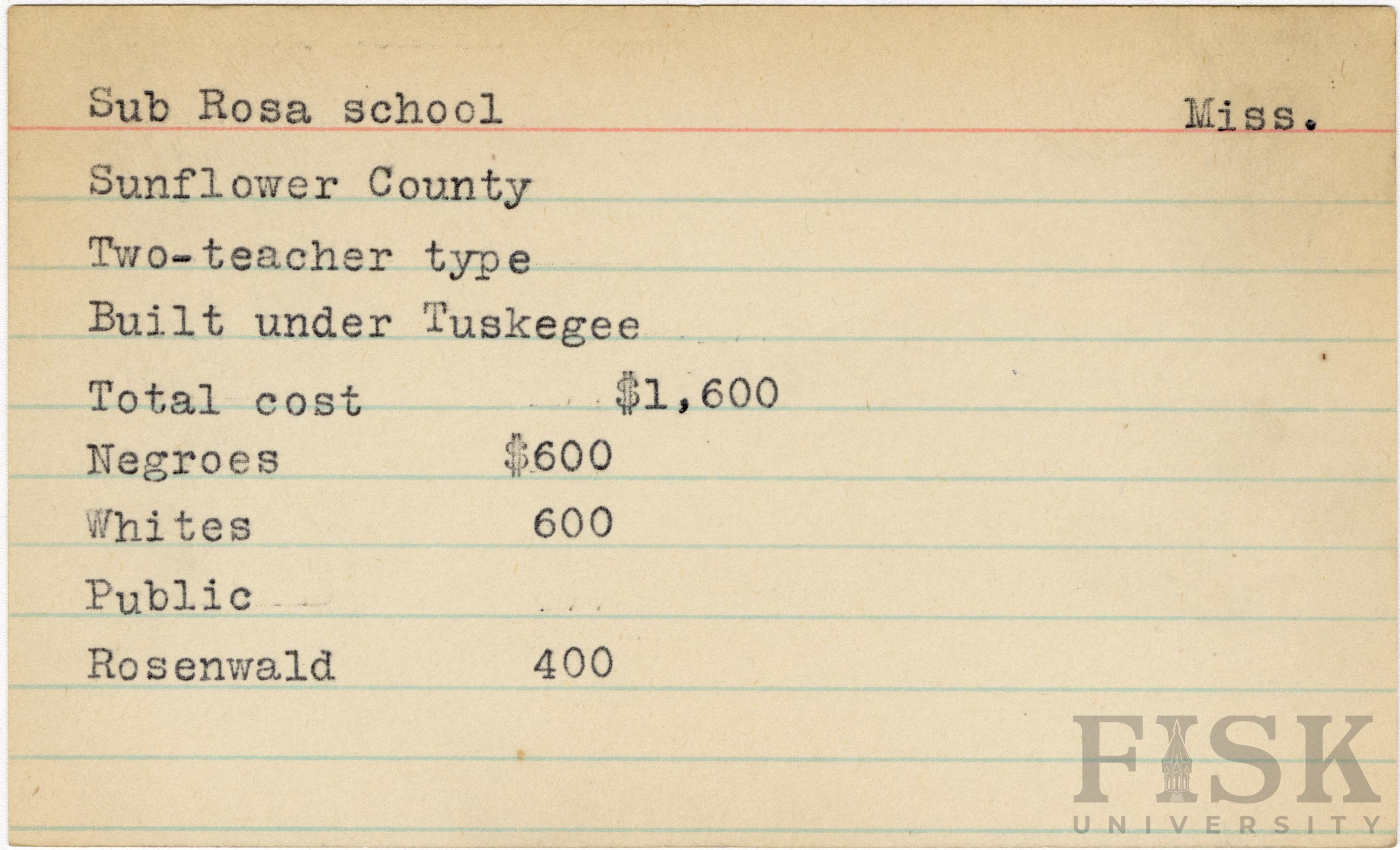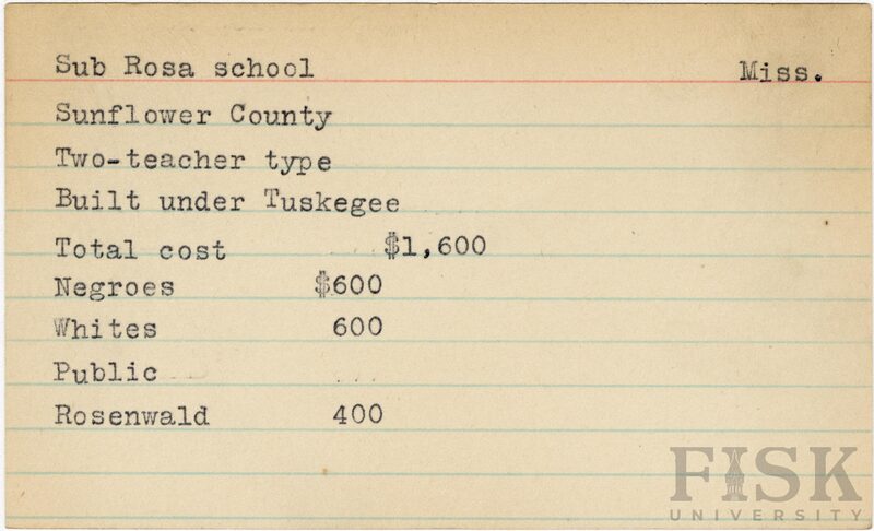 - School card from Rosenwald Fund for Sub Rosa School in Sunflower County, Mississippi