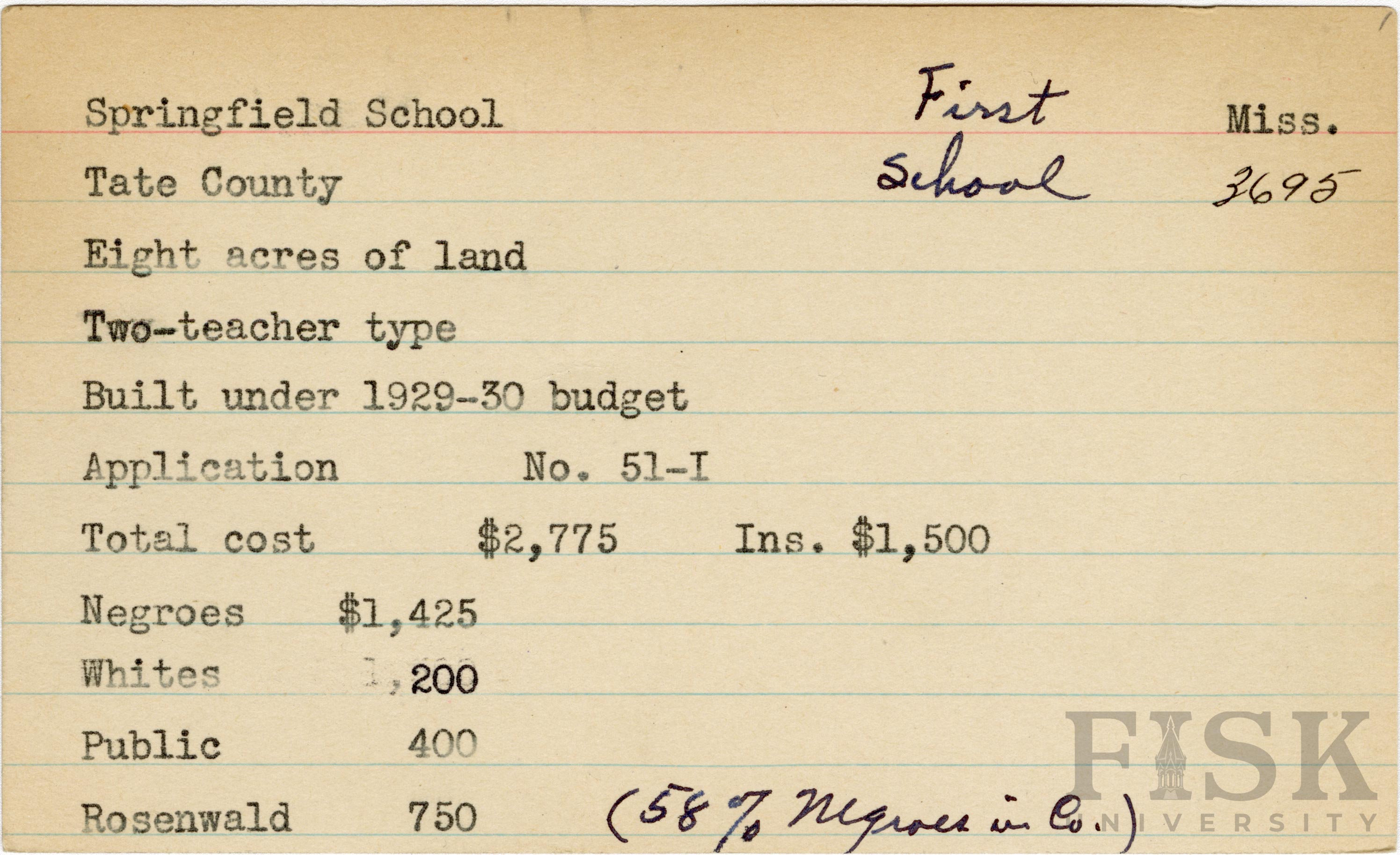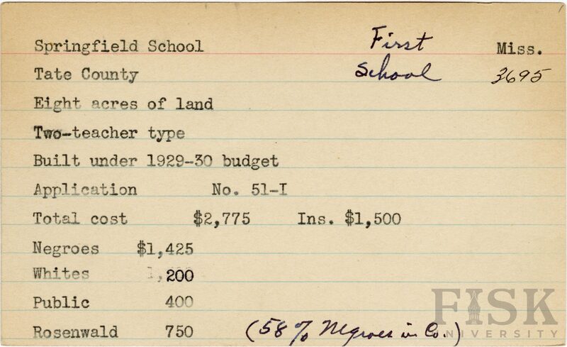 - School card from Rosenwald Fund for Springfield School in Tate County, Mississippi with a section added to the budget contributions that says, "Ins. $1,500". Handwritten notes on the card say, "first school" and "(58% negroes in Co.)"