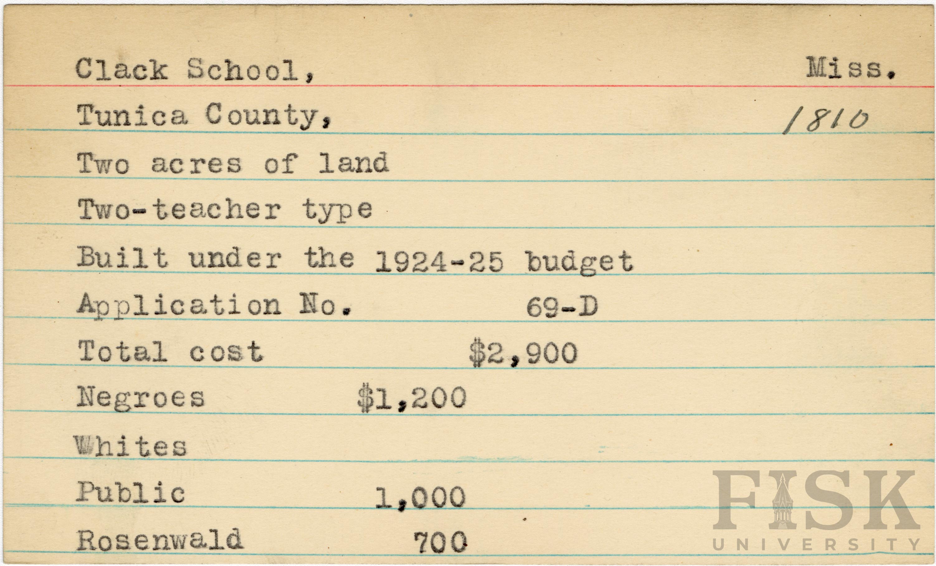 - School card from Rosenwald Fund for Clack School in Tunica County, Mississippi
