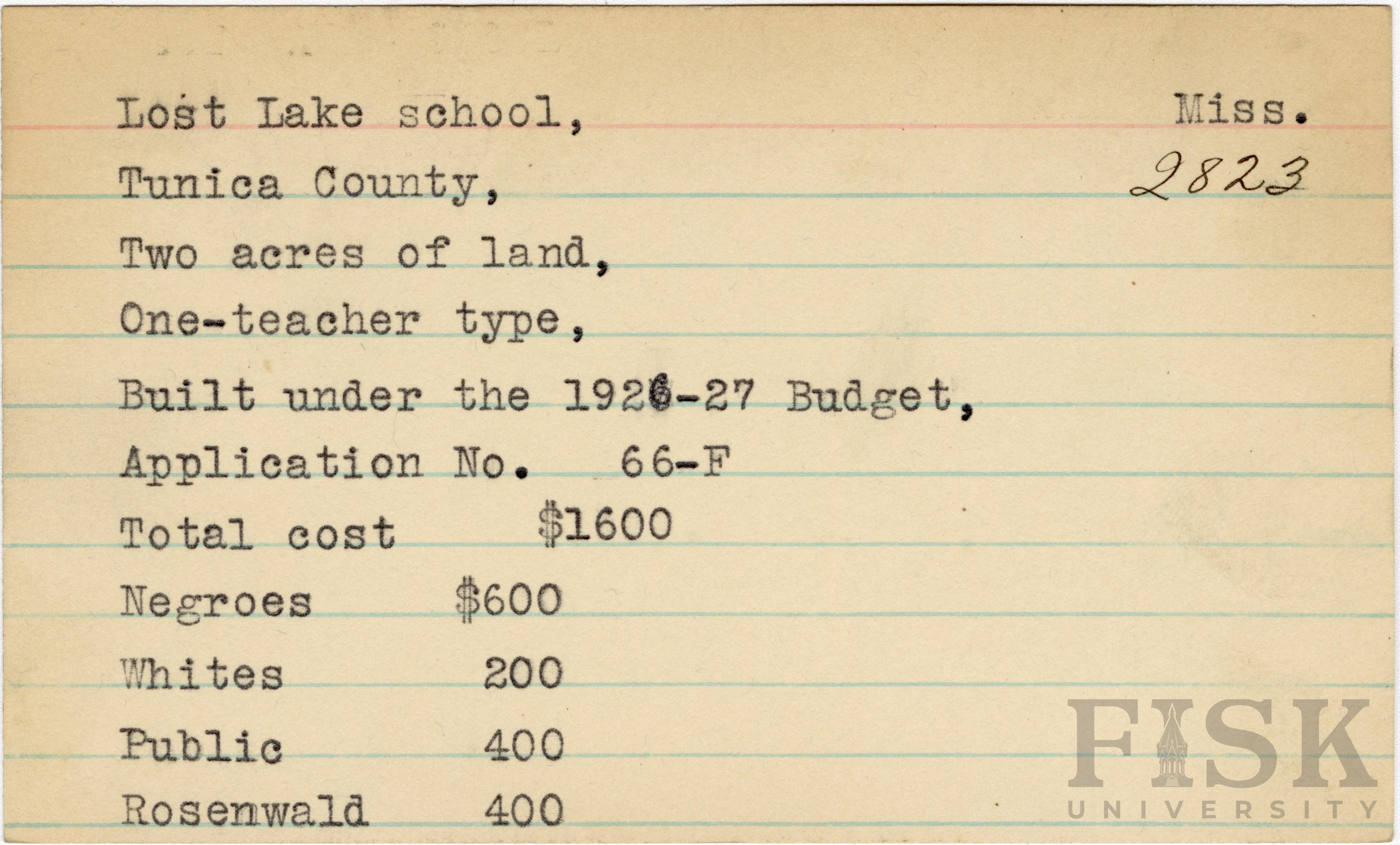 - School card from Rosenwald Fund for Lost Lake School in Tunica County, Mississippi