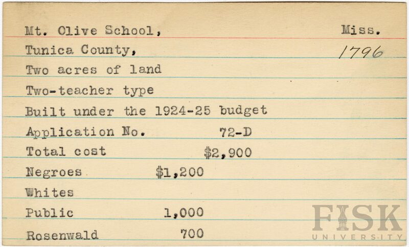 - School card from Rosenwald Fund for Mt. Olive School in Tunica County, Mississippi