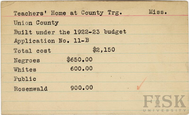 - School card from Rosenwald Fund for the teacher's home at New Albany School in Union County, Mississippi