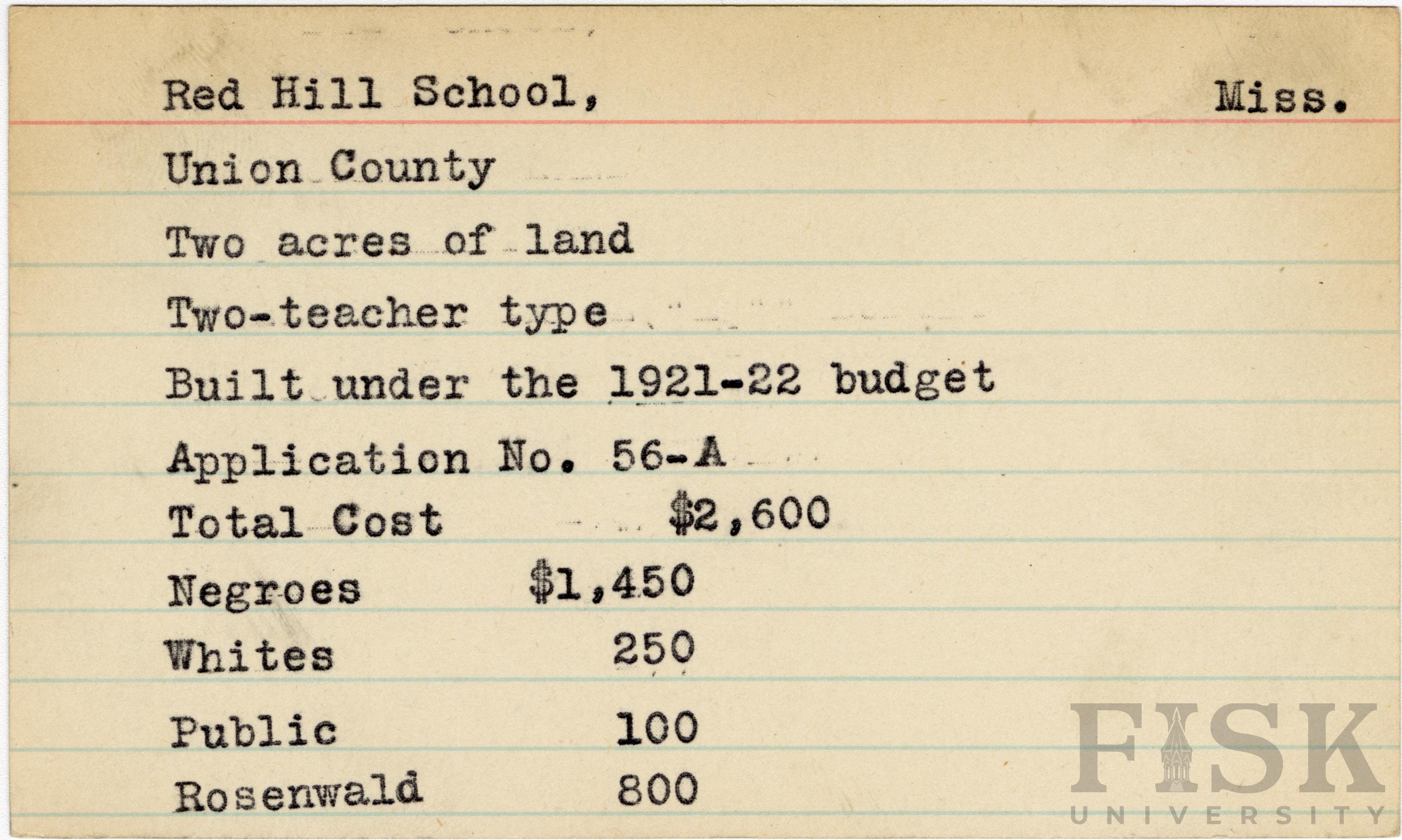 - School card from Rosenwald Fund for Red Hill School in Union County, Mississippi