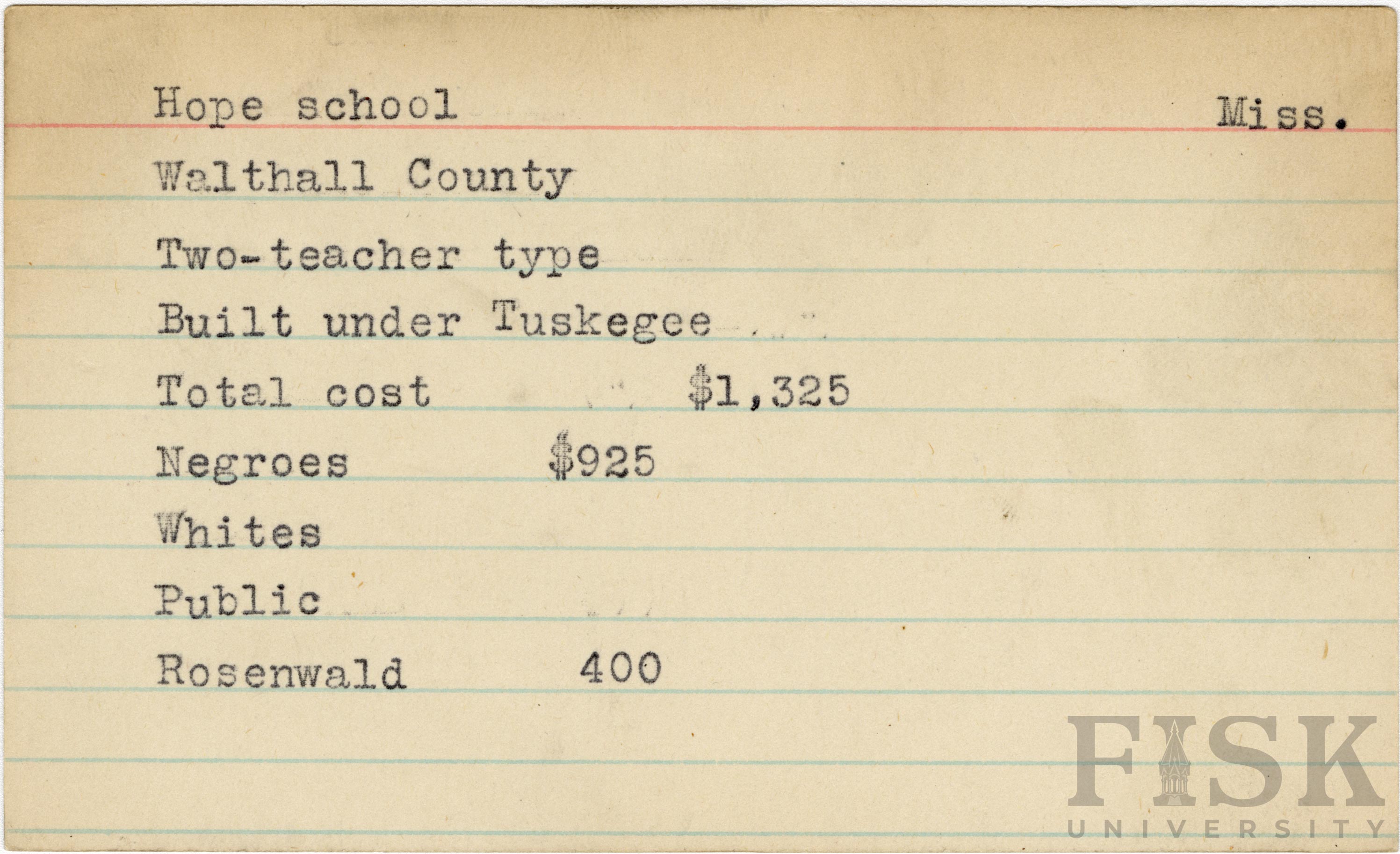 - School card from Rosenwald Fund for Hope School in Walthall County, Mississippi
