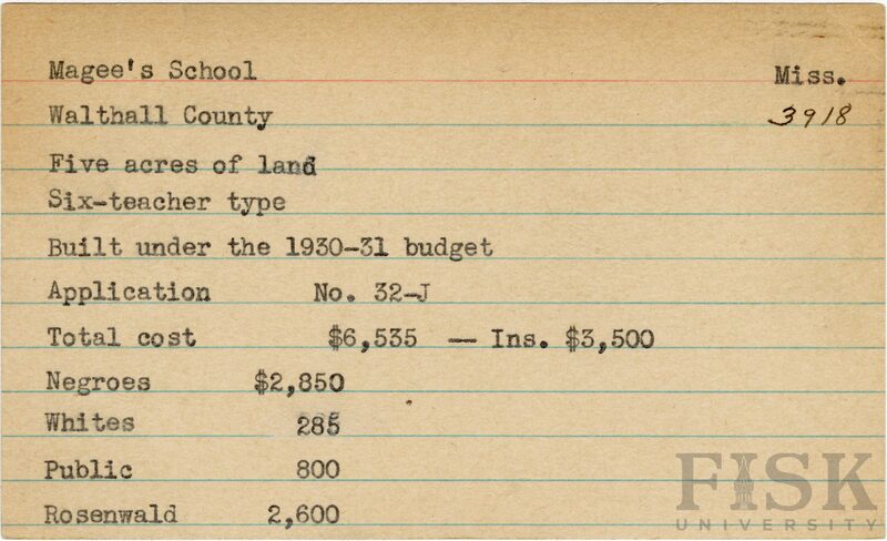 - Julius Rosenwald Fund, Julius Rosenwald Fund--Buildings, African American schools--History--20th century, African American schools -- Magee's School