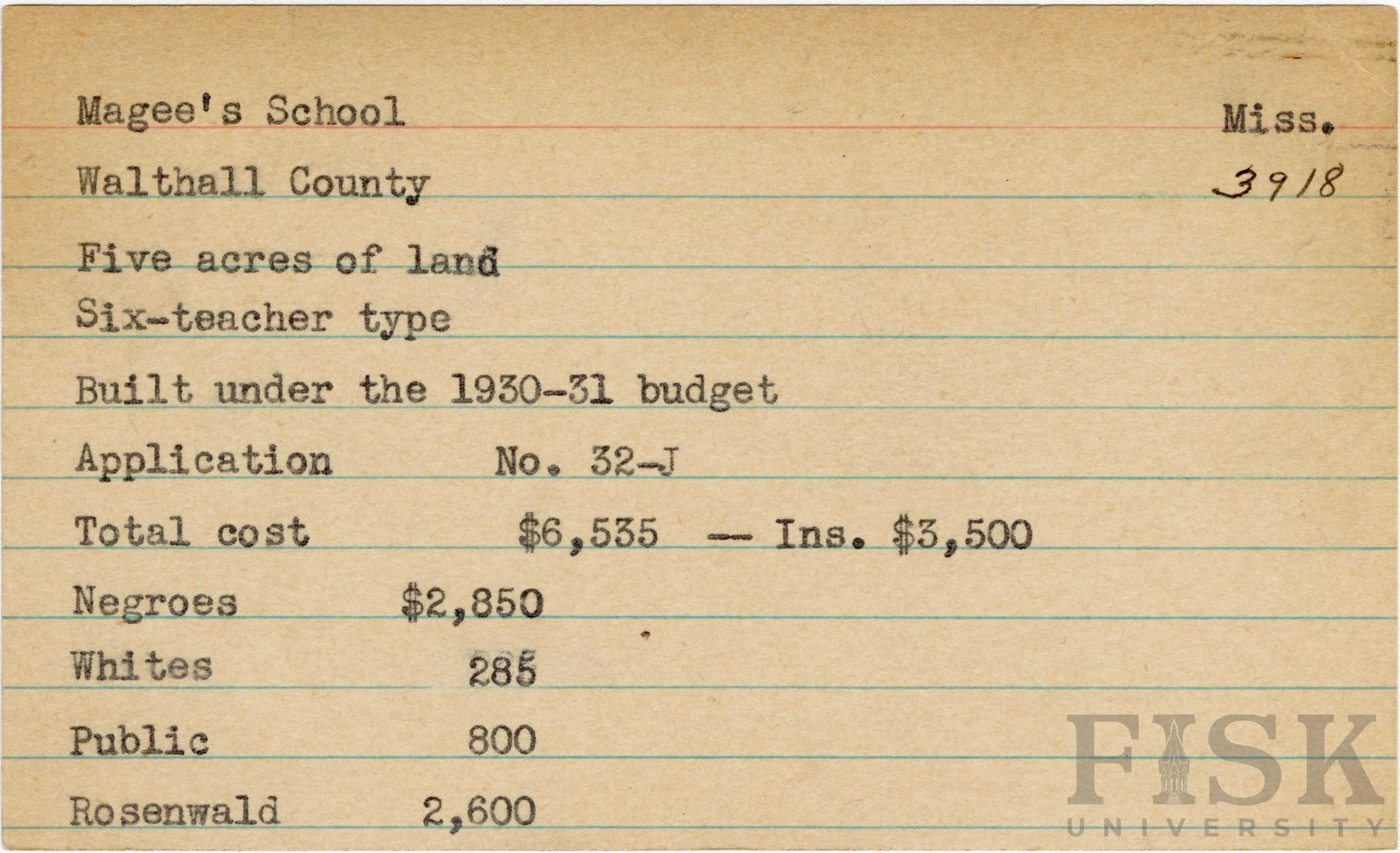 - School card from Rosenwald Fund for Magee's School in Walthall County, Mississippi with a section added to the budget contributions that says, "Ins. $3,500"