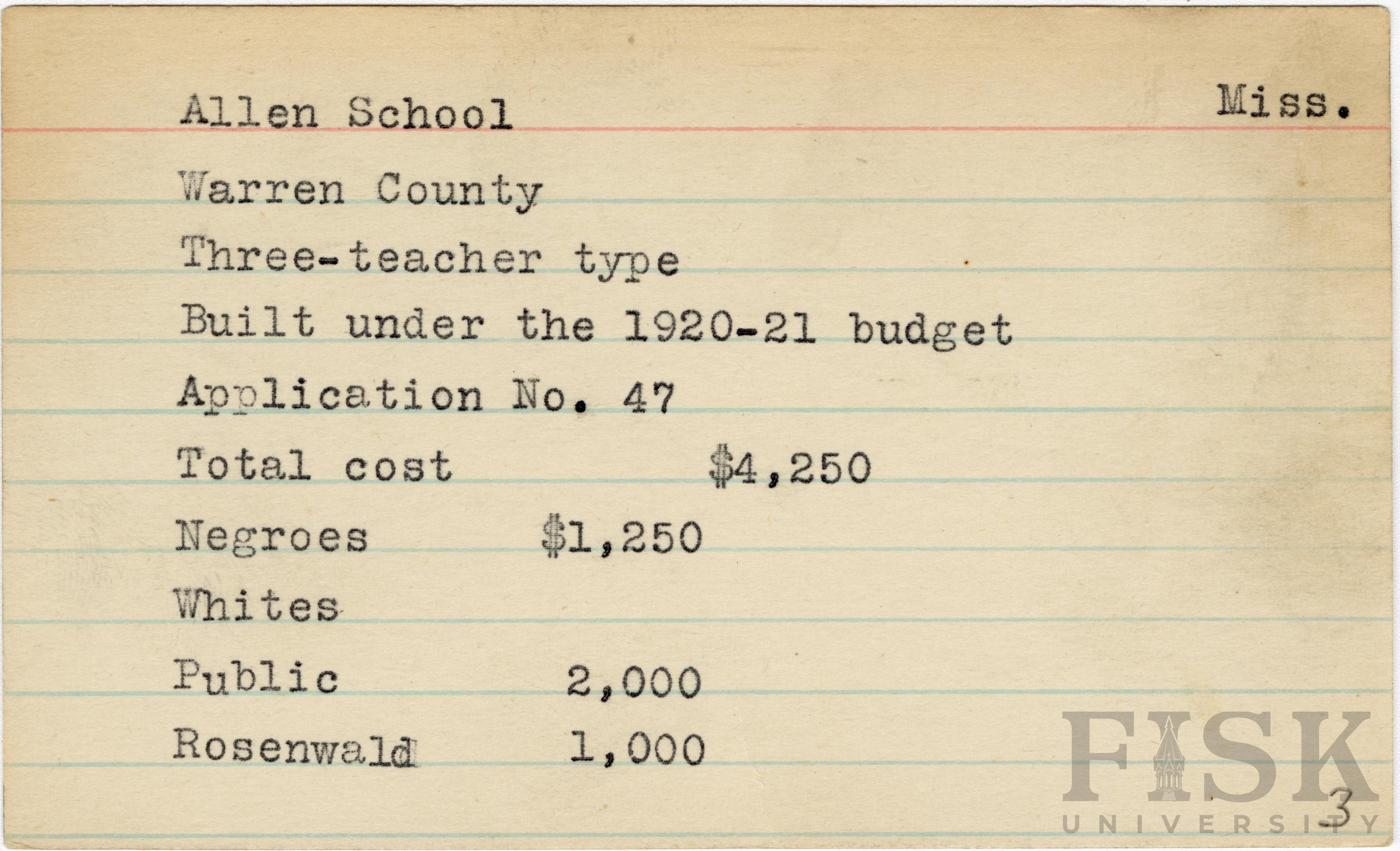 - School card from Rosenwald Fund for Allen School in Warren County, Mississippi