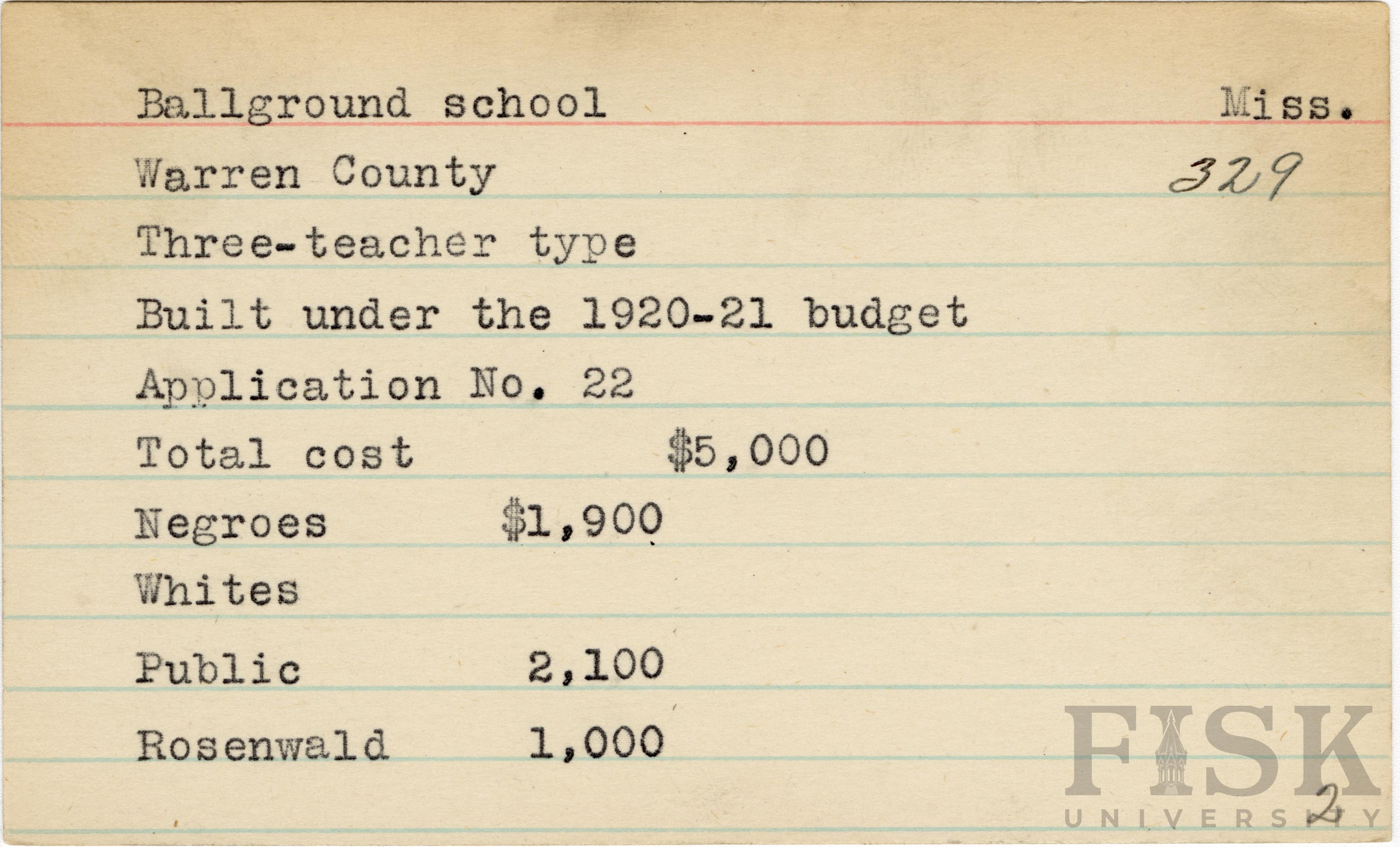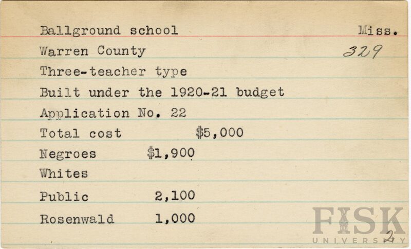 - School card from Rosenwald Fund for Ballground School in Warren County, Mississippi