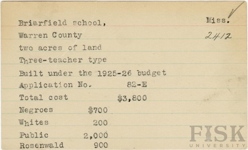 - School card from Rosenwald Fund for Briarfield School in Warren County, Mississippi