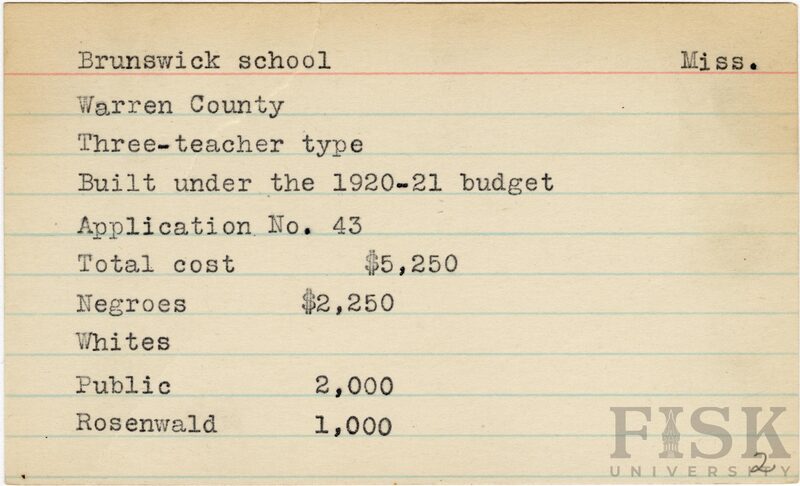 - School card from Rosenwald Fund for Brunswick School in Warren County, Mississippi