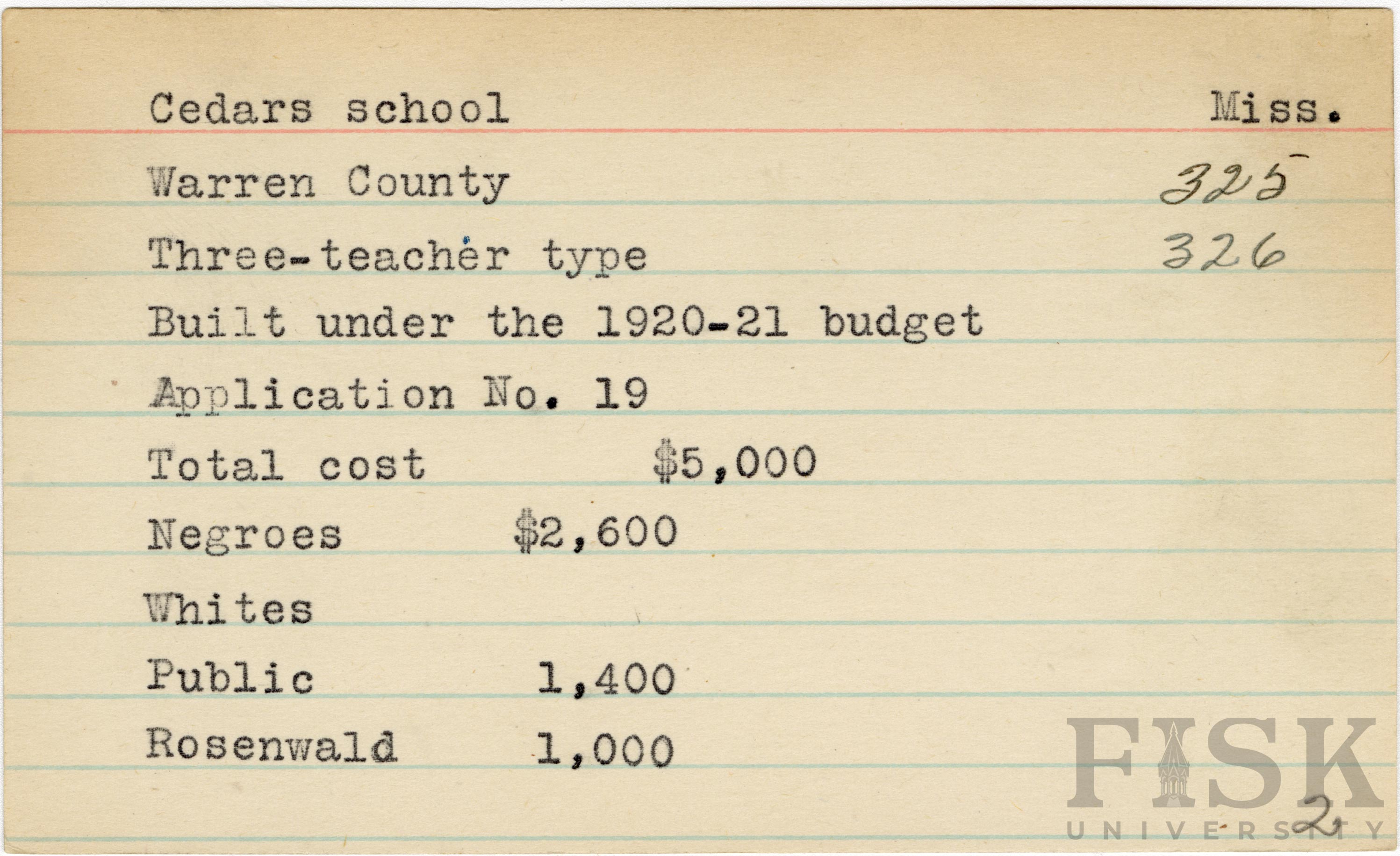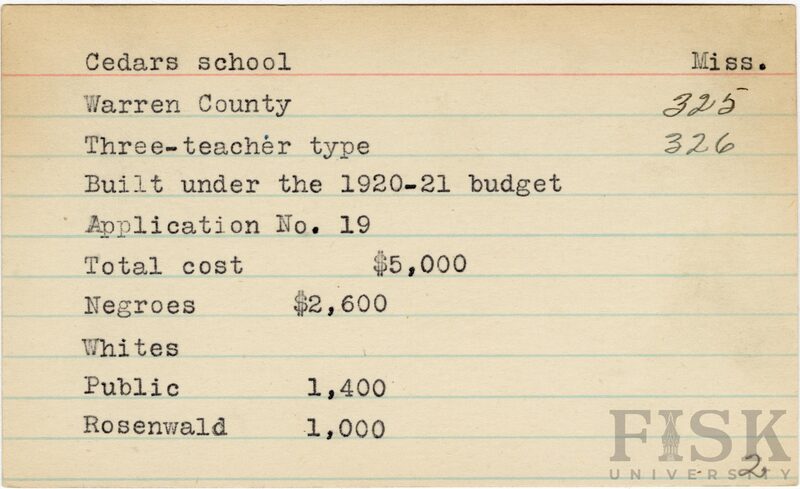 - School card from Rosenwald Fund for Cedars School in Warren County, Mississippi