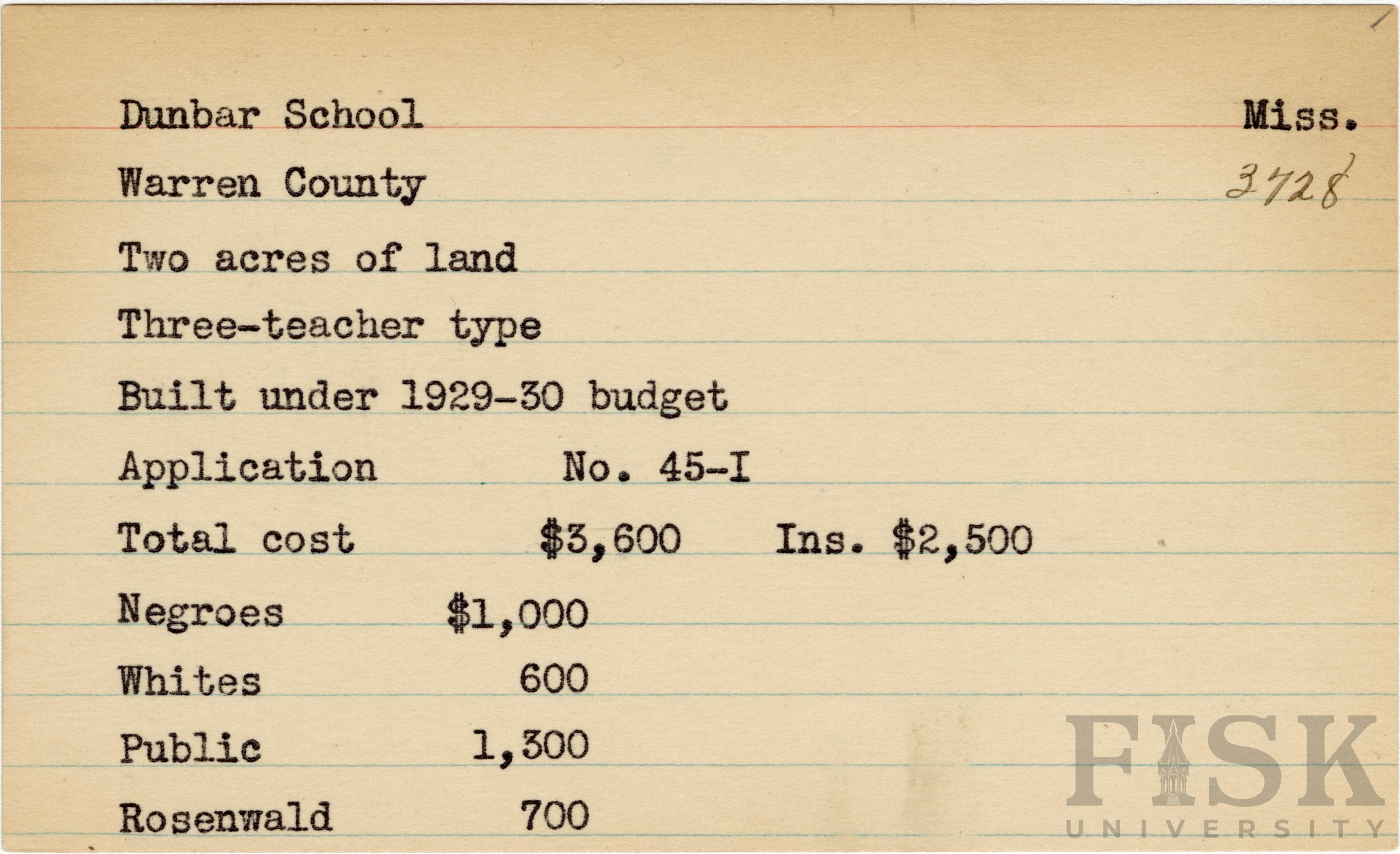 - School card from Rosenwald Fund for Dunbar School in Warren County, Mississippi with a section added to the budget contributions that says, "Ins. $2,500"