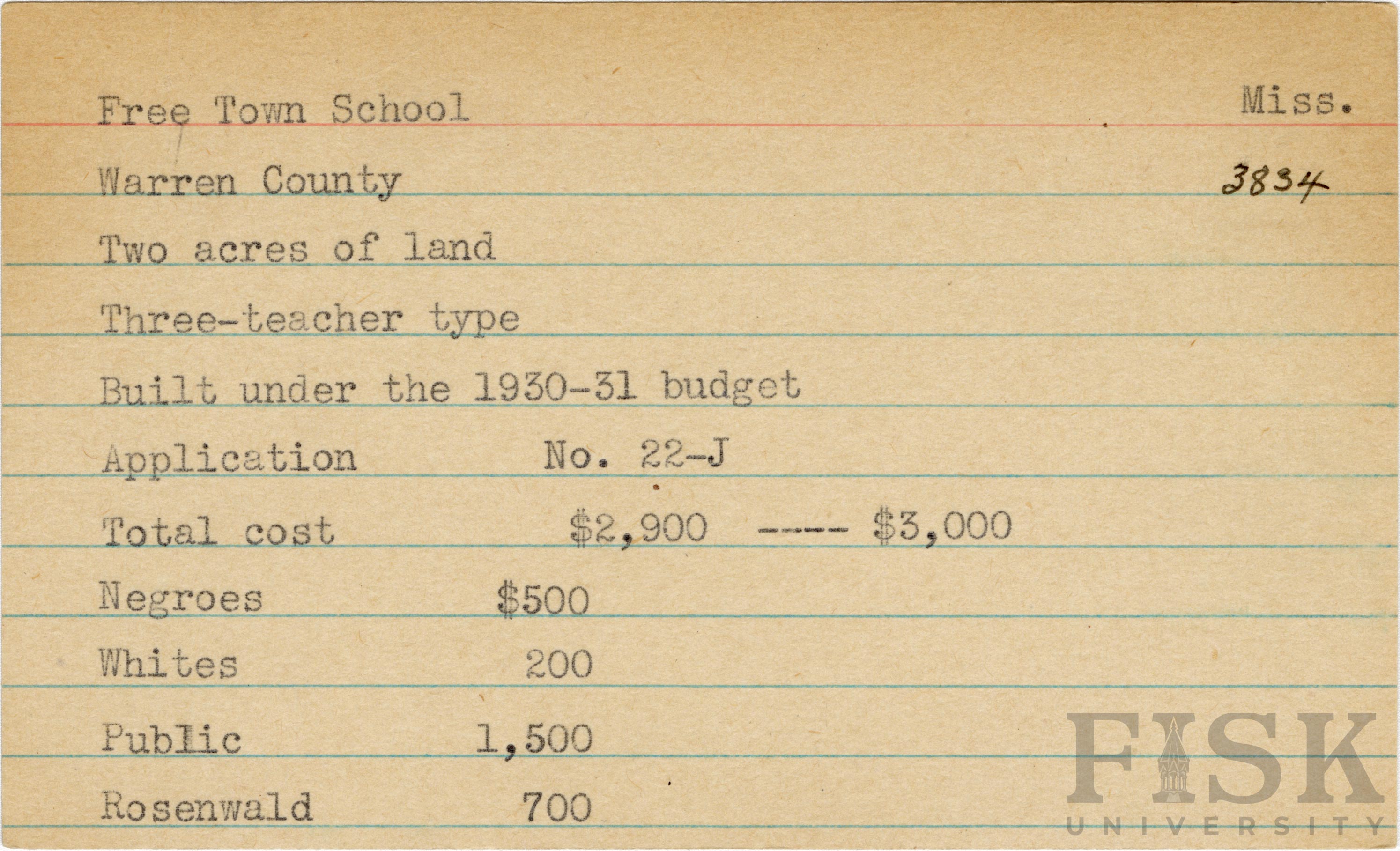 - School card from Rosenwald Fund for Free Town School in Warren County, Mississippi with a section added to the budget contributions that says, "Ins. $3,000"