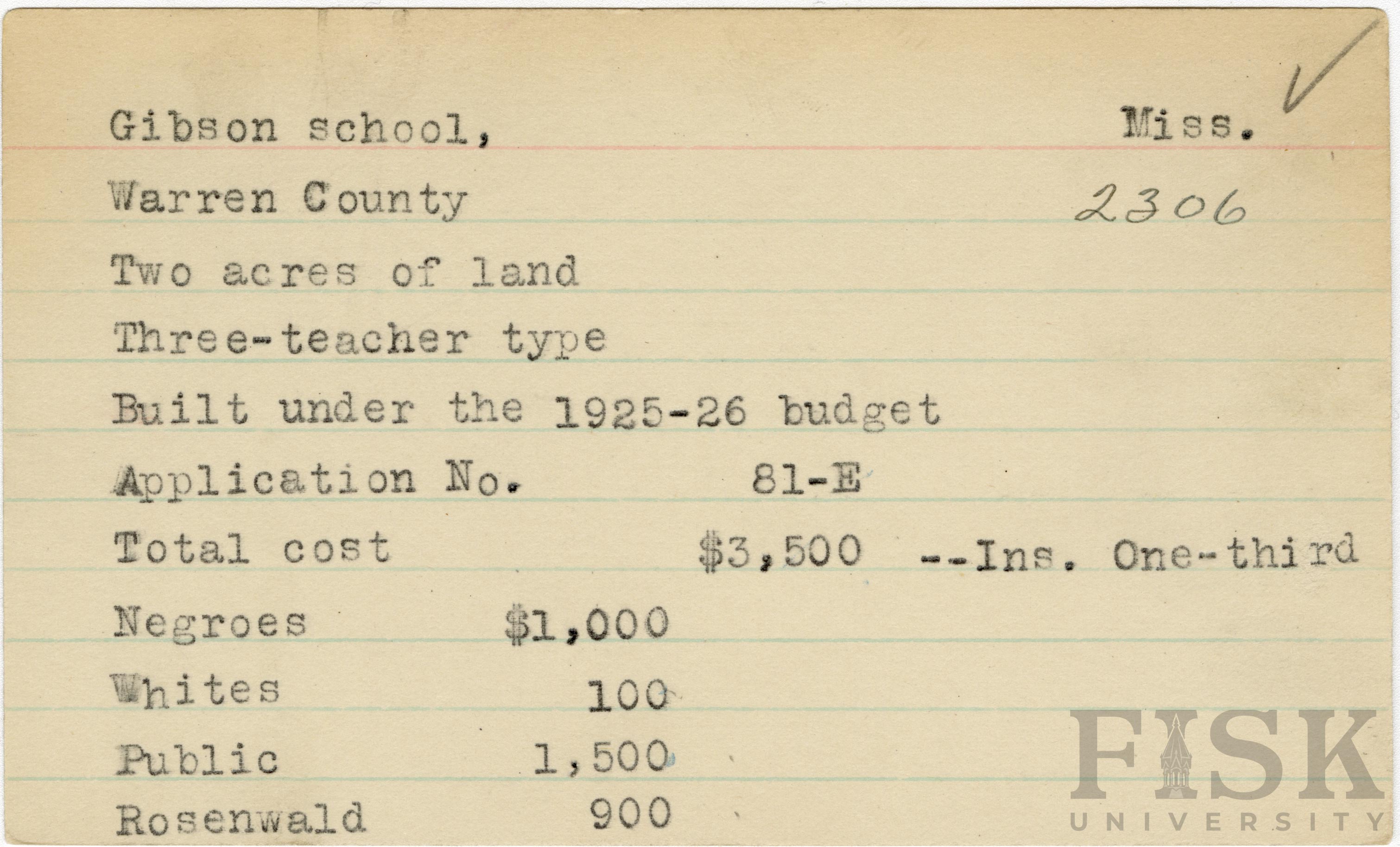 - School card from Rosenwald Fund for Gibson School in Warren County, Mississippi with a section added to the budget contributions that says, "Ins. One-third"