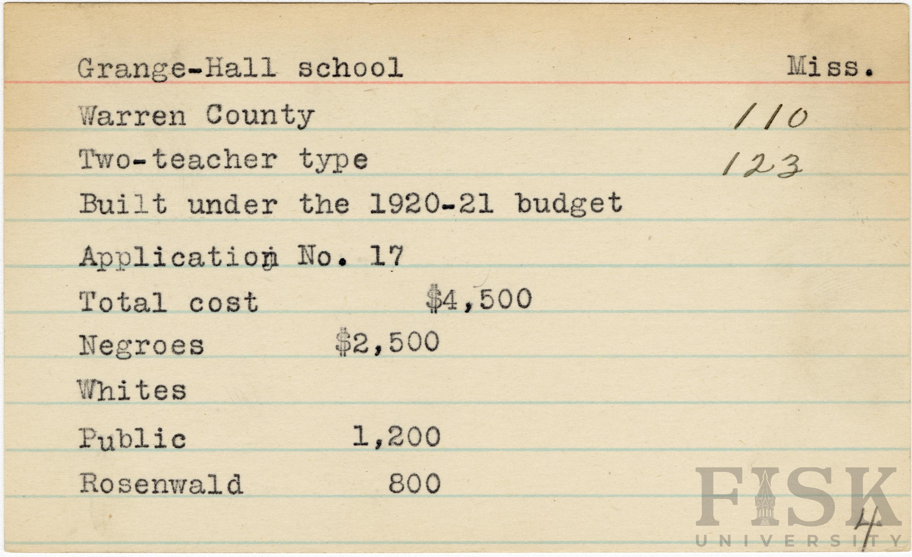 - School card from Rosenwald Fund for Grange-Hall School in Warren County, Mississippi