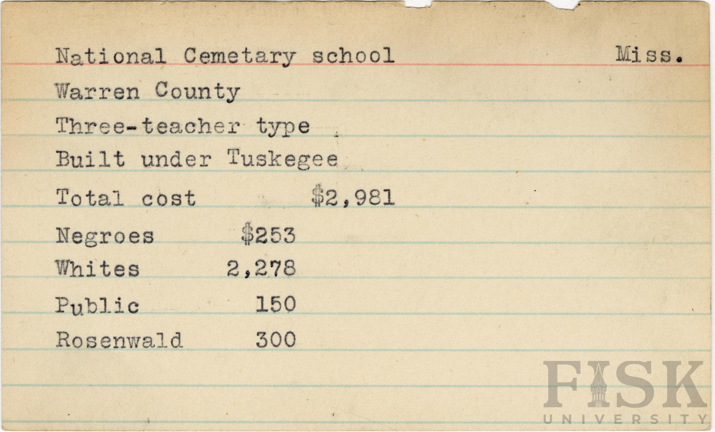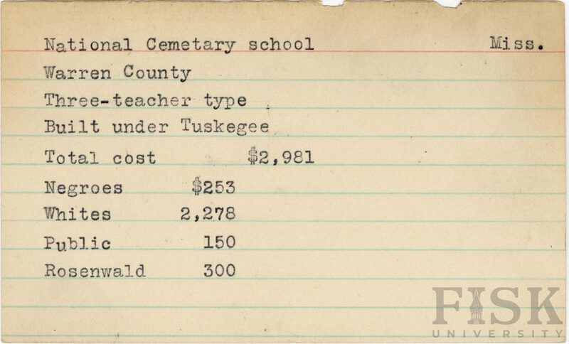 - School card from Rosenwald Fund for National Cemetary School in Warren County, Mississippi