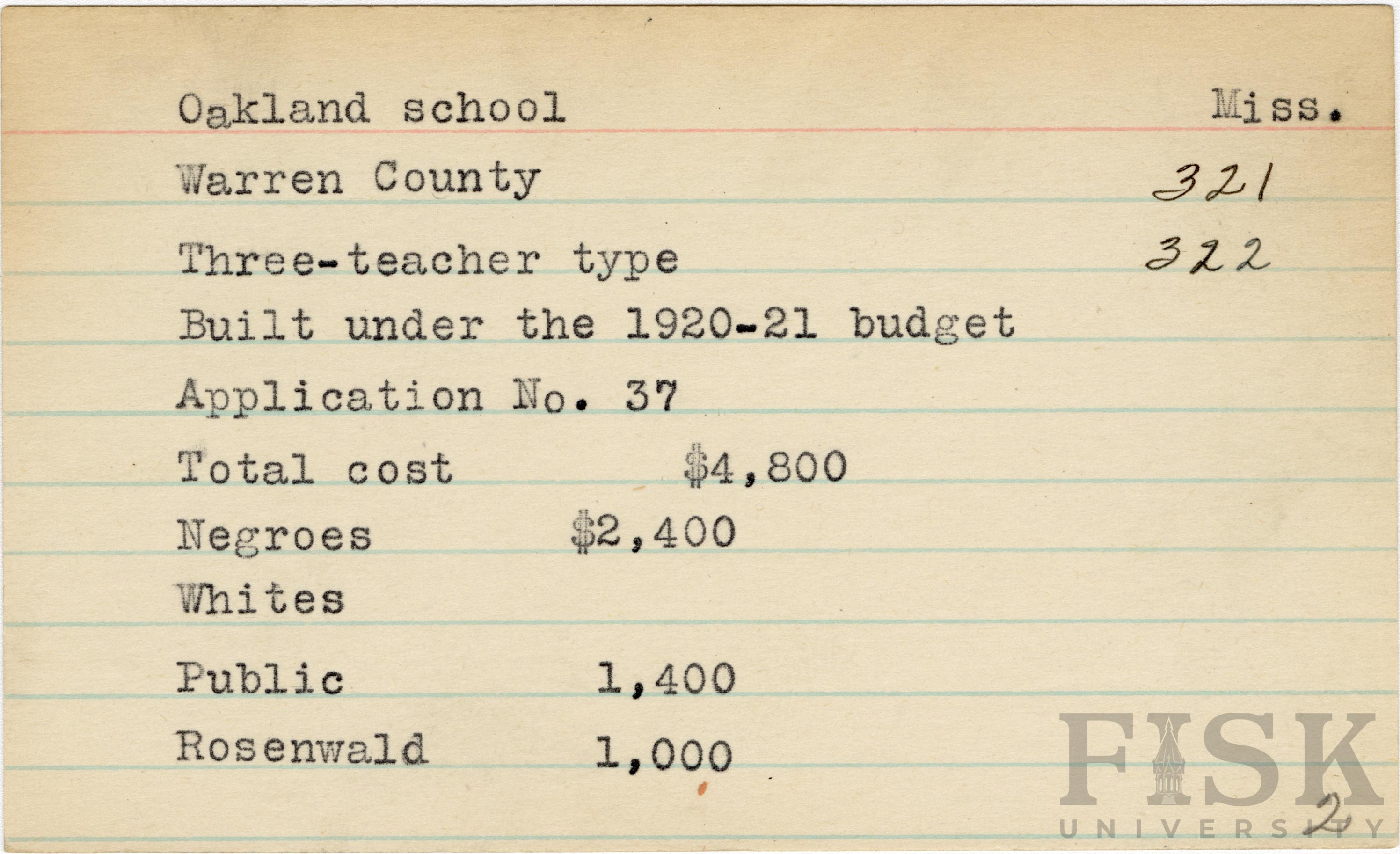 - School card from Rosenwald Fund for Oakland School in Warren County, Mississippi