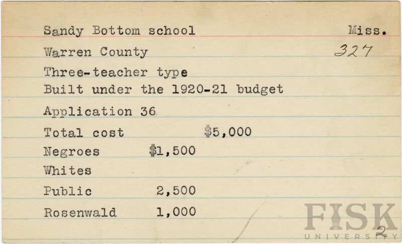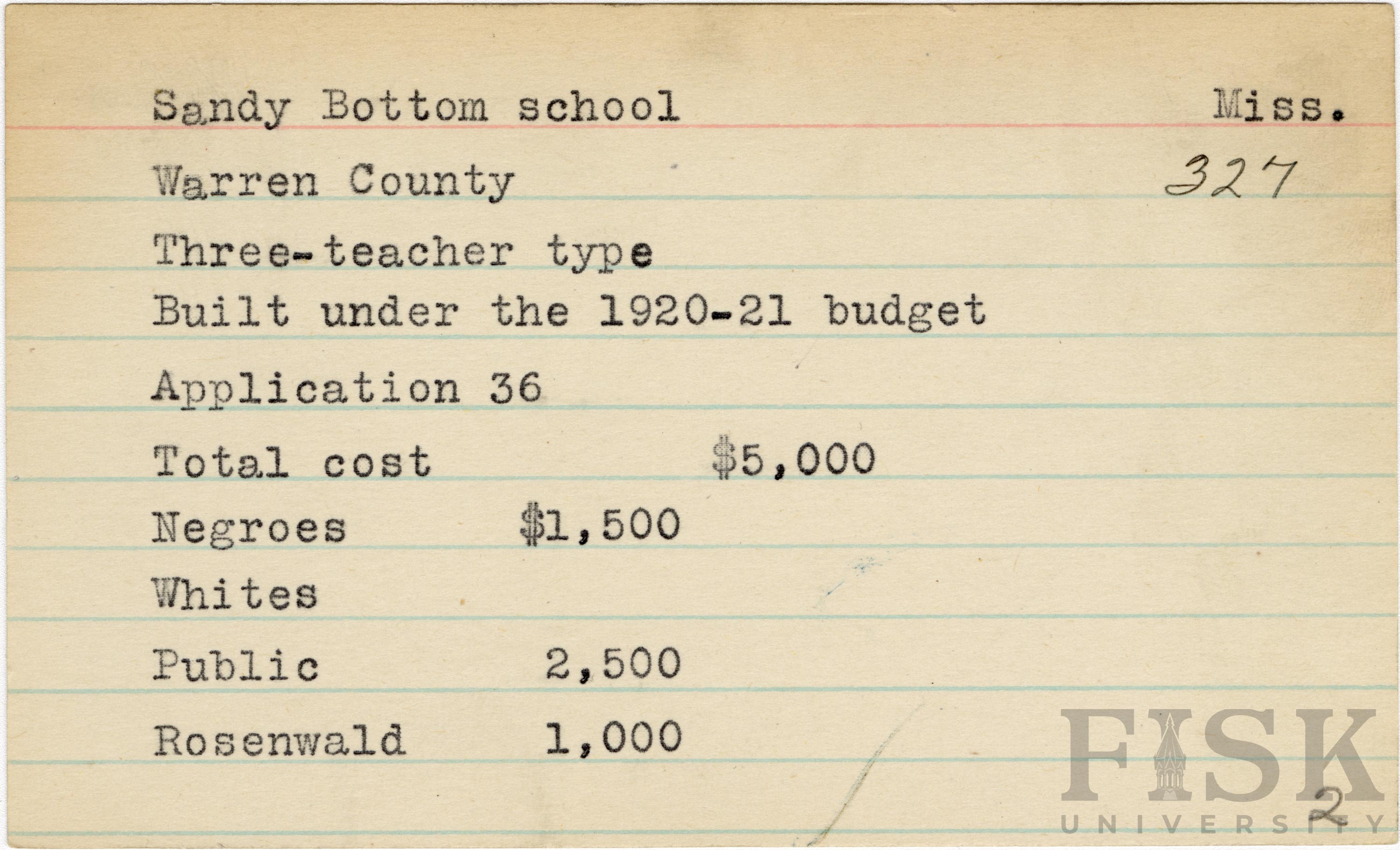 - School card from Rosenwald Fund for Sandy Bottom School in Warren County, Mississippi